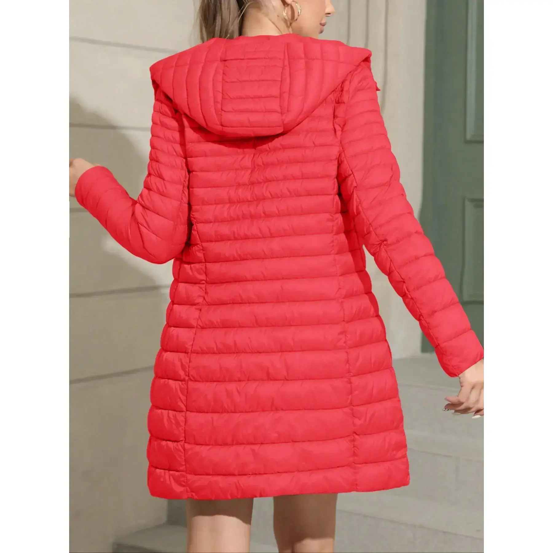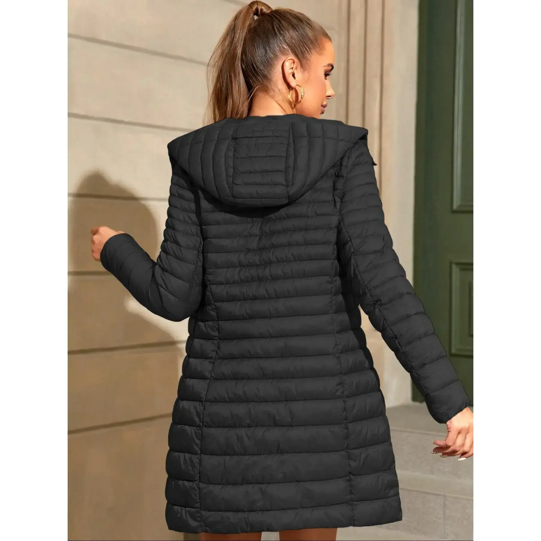 Women's Mid-Length Puffer Coat, Casual Hooded Jacket with Pockets, Fall & Winter Warm Woven Outerwear, Lightweight Thick Fabric