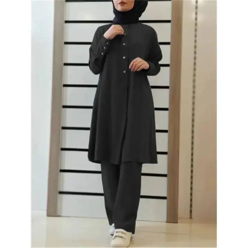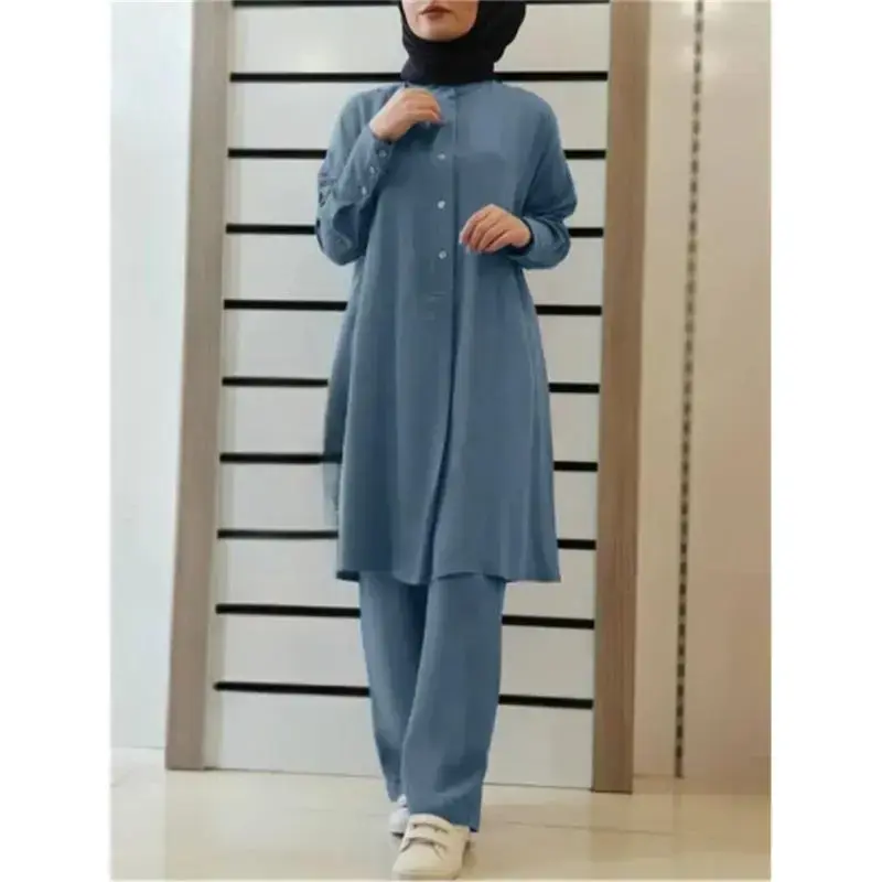 In-Stock H728 # Muslim Women's New Solid Color Two-Piece Shirt and Pants Set, Casual Loose Fit Outfit Tunic Modest Can be used with raincoat