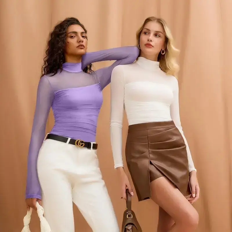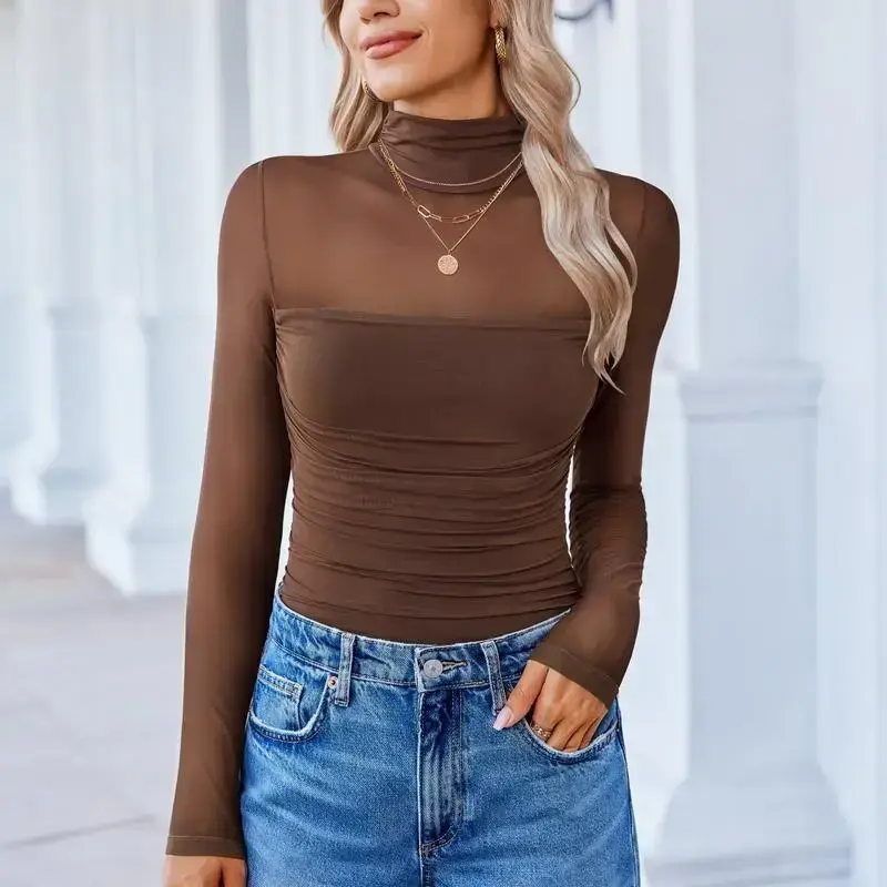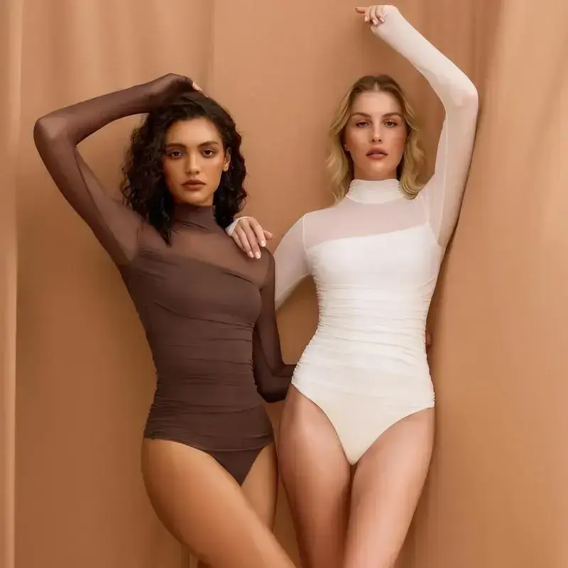 Fabric Crafted from premium 75% Nylon & 25% Spandex blend, this long sleeve bodysuit offers luxurious softness with exceptional elasticity. The silky-smooth texture contours perfectly to your figure while providing remarkable stretch flexibility, accommodating diverse body shapes beautifully. NOTE: This bodysuit provides gentle compression - consider sizing up for a more relaxed fit./Features This elegant mesh bodysuit showcases a sophisticated high neckline with translucent long sleeves. The innovative dual-layer construction includes artistic gathered details throughout the torso, creating a flattering silhouette from bust to waistline. This thoughtful design elevates basic wardrobe essentials with refined detailing and versatile appeal./Construction Features a sleek thong-style bottom for invisible lines under any outfit. Equipped with secure dual-snap fasteners at the base for stability and convenience during wear. An ideal foundation piece for contemporary women's fashion./Versatility This sculpting bodysuit pairs effortlessly with denim, trousers, skirts, or blazers to create polished, alluring, and sophisticated ensembles. Perfect for everyday styling, urban fashion, music festivals, nightlife, social gatherings, romantic evenings, coastal getaways, and travel adventures./Contents Includes: 1 premium long sleeve mesh bodysuit.