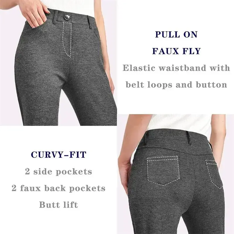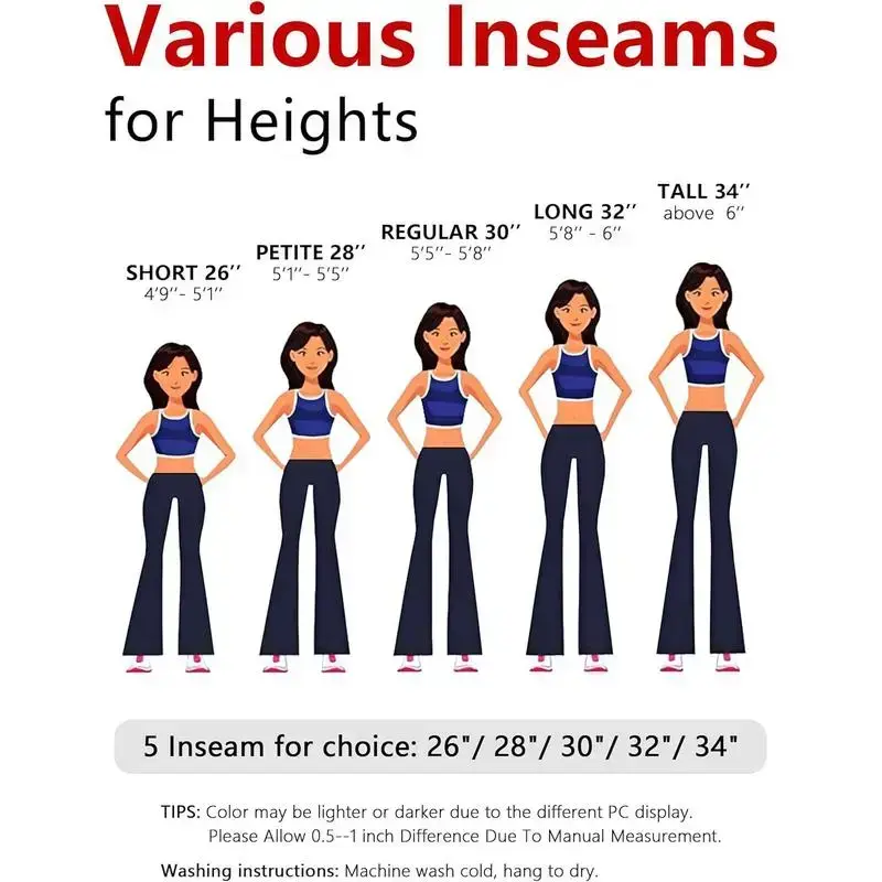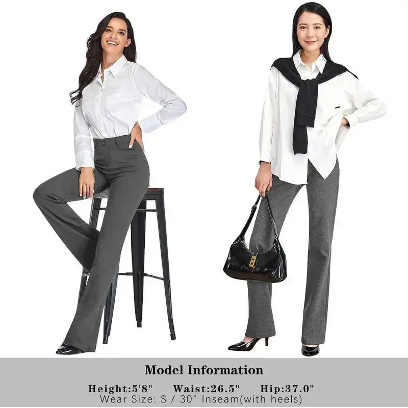 Fabric type Black, Navy Blue, Brown, Oatmeal, New Burgundy, Olive, Red: 68.6% Rayon, 27.5% Nylon, 3.9% Elastane White: 95% Polyester, 5% Elastane Charcoal, New Charcoal: 65% Rayon, 30% Nylon, 5% Elastane Black Pinstripe: 66% Rayon, 15% Nylon, 14% Polyester, 5% Elastane. Closure type Pull On Inseam 30 Inches Rise style Mid Rise 5 INSEAM LENGTHS: These womens dress pants feature with five inseam lengths: Short - 26" inseam fits women 4'9" - 5'1" / Petite - 28" inseam fits women 5'1" - 5'5" / Regular - 30" inseam fits women 5'5" - 5'8" / Long - 32" inseam fits women 5'8" - 6'/ Tall - 34" inseam fits women above 6'.Please refer to the size chart shown on the last picture for your right length of pants.Tall pants for women, long pants and petite pants are available STRETCHY & SOFT BOOTCUT: Material blended with spandex makes office work pants cotton soft and 4-way stretch, fitting like yoga pants.Boot-cut fits through hip to thigh, slight flared from the knee down, curvy-fit over your sleek shape and makes you elegant. 2 FRONT POCKETS & 2 BACK POCKETS: Pants wear to work with two functional front pockets and two back pockets can safely hold your belongings. COZY PONTE DRESS PANTS: The knit ponte fabric with a flattering fit, providing all-day comfort while holding its shape.Well made of nice thick material, so you don’t have to worry about them being see-through.It can meet your expectation about slacks for women business casual: comfortable, wrinkle-resistant, and non-pilling. DRESSY DESIGN: Flat front, non-functional button, belt loops and faux fly make pants dressy, ideal for office work, meeting, teaching and business casual. Women's slacks with mid rise and slight flare cut also fit casual wear. Find your right inseam: Short/26" Petite/28" Regular/30" Long/32" Tall/ 34" Color may be lighter or darker due to the different PC display.Please Allow 0.5--1 inch Difference Due To Manual Measurement. Great pants for office work, business trip and daily wear, and these can pass as yoga pants. Workwear clothing that helps women stay focused, confident and comfortable through their workdays. Great pants for office work, business trip and daily wear, and these can pass as yoga pants. Workwear clothing that helps women stay focused, confident and comfortable through their workdays.