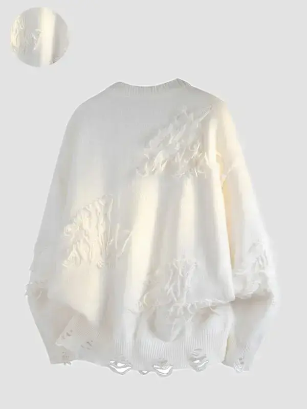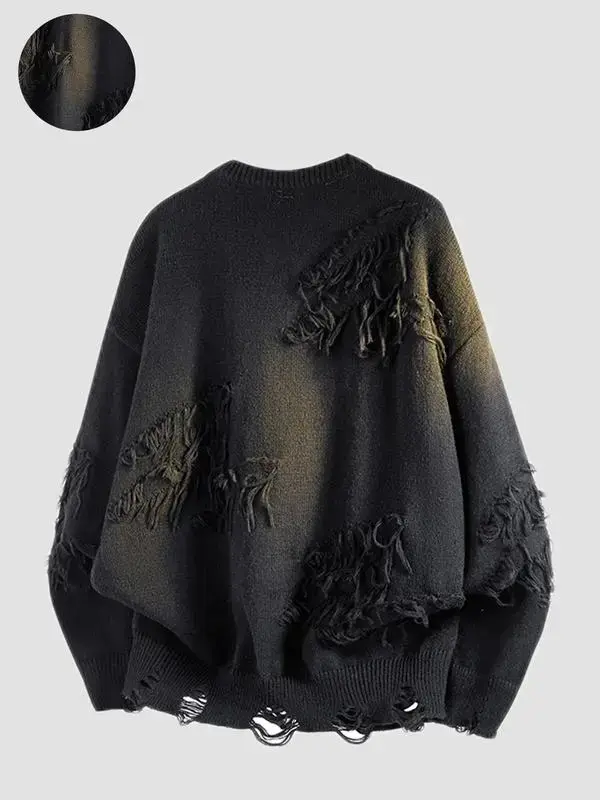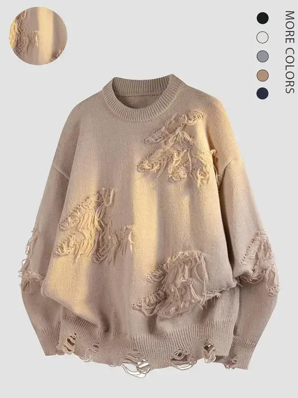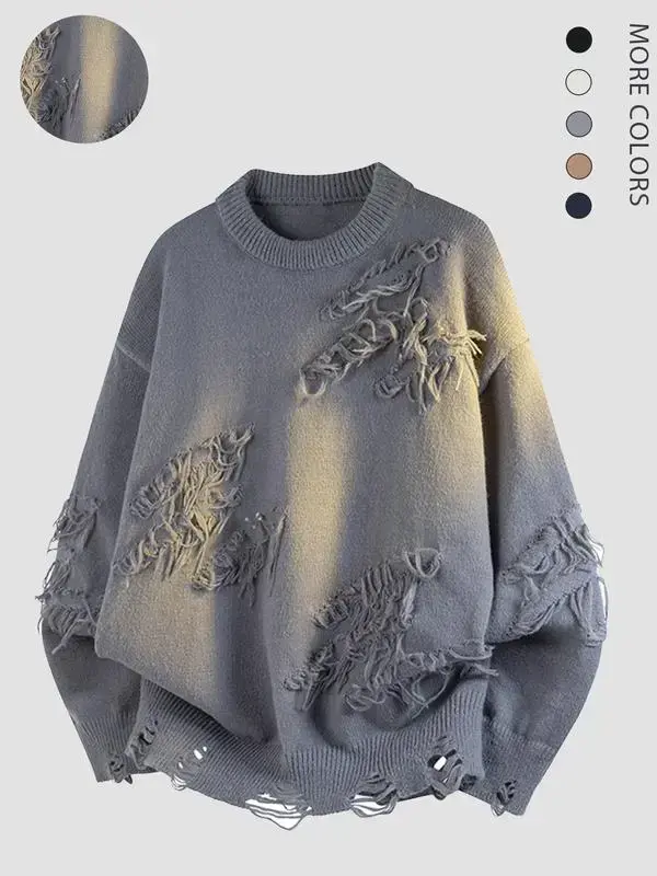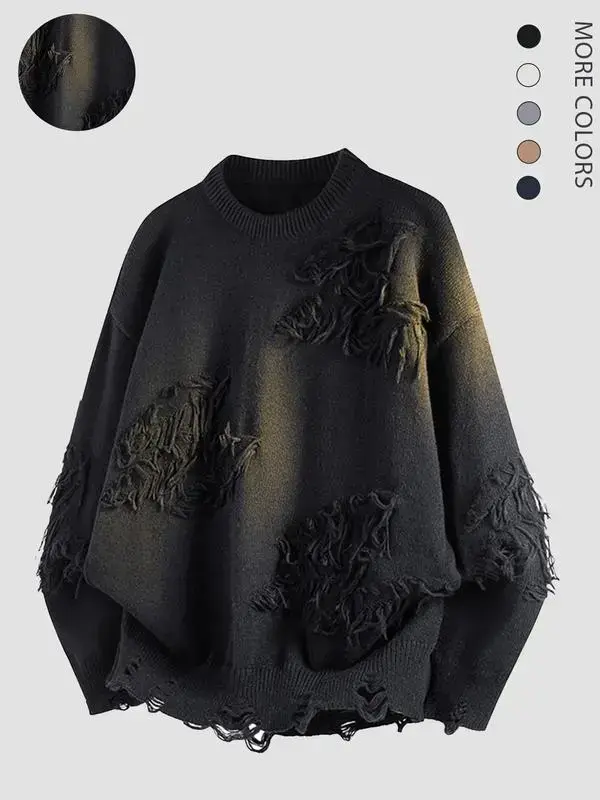 ��Distinctive Ripped Look��: Features a unique distressed aesthetic, providing a trendy, vintage appeal that differentiates it from standard knitwear. ��Thick Fabric��: Constructed with moderate fabric thickness, offering warmth and durability suitable for the fall and winter seasons. ��Unisex Design��: Designed to fit all genders, allowing for a shared wardrobe option, enhancing its overall appeal for diverse consumers. ��Classic Round Neck��: Equipped with a round neckline, this garment offers a timeless silhouette, ensuring a universally flattering fit. ��Lightweight Knit��: Made from knitted fabric, the sweater provides a soft texture while being lightweight, making it comfortable for everyday wear.