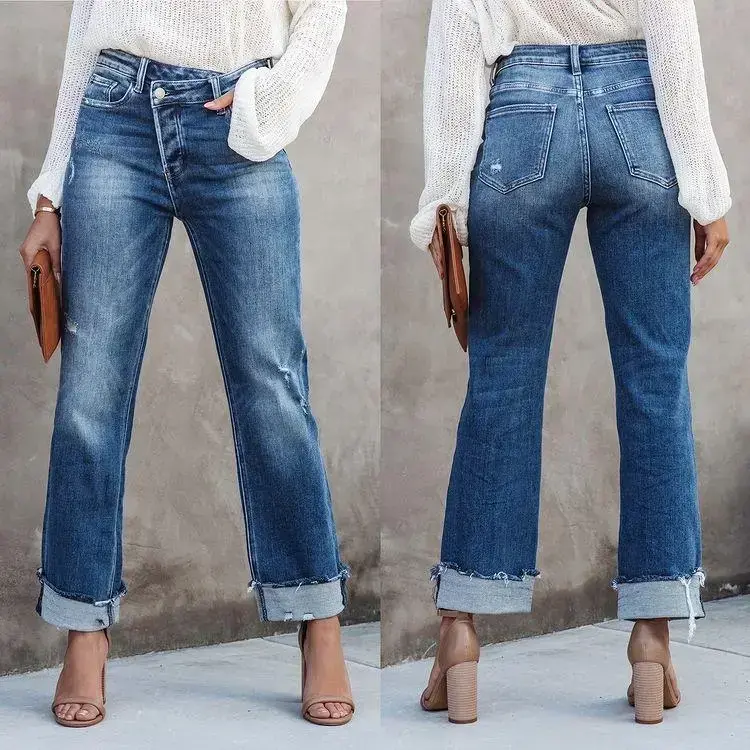 Women'sHighWaistedStraightLegJeansCrossoverStretchCasualCuffedDenimPants(gift)