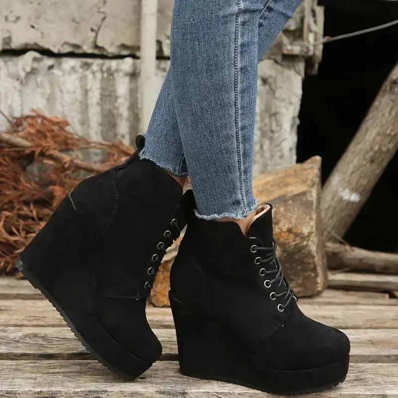 Cozy Thermal Wedge Ankle Boots - Ankle & Bootie - Warm Plush Lined, Lace Up, Platform, Short, Winter Boots for Women