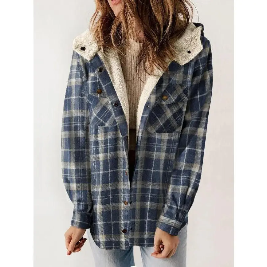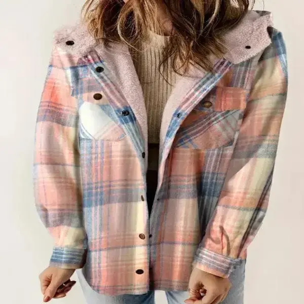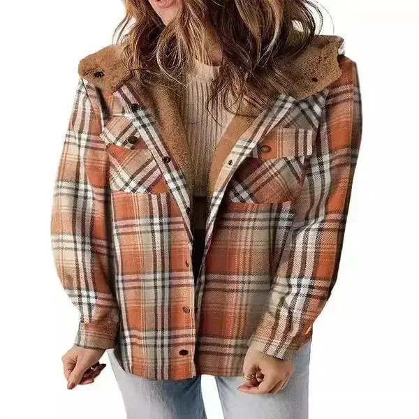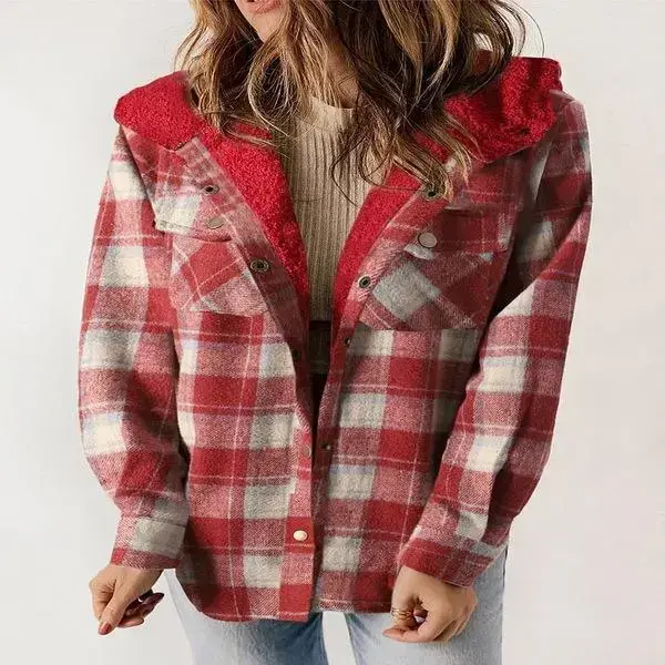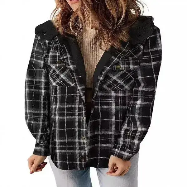 Stay Warm and Stylish ?? This women's plaid shacket jacket is perfect for chilly days. It features a long sleeve design with a button-down front, offering both style and functionality. The fleece hood adds extra warmth, making it ideal for outerwear. This versatile piece combines comfort with a classic plaid pattern. Ideal for layering, it's a must-have for your wardrobe. Key Features ?? Versatile and Comfortable ?? This jacket is designed to keep you warm while maintaining a chic appearance. Its simple yet elegant style makes it a great choice for various occasions. Enjoy the convenience of a button-down front and the warmth of the fleece hood. Perfect for layering and everyday wear.
