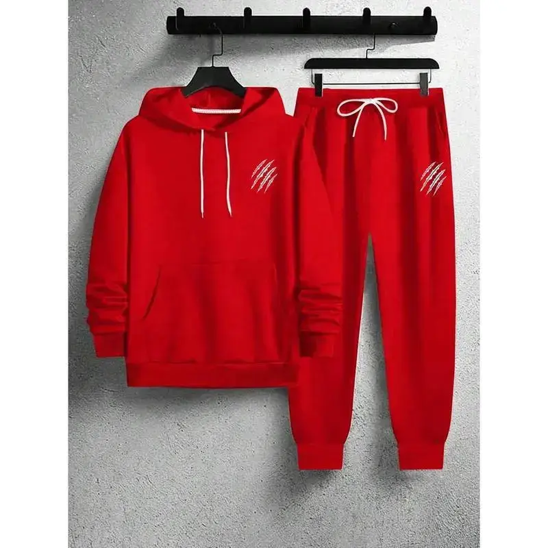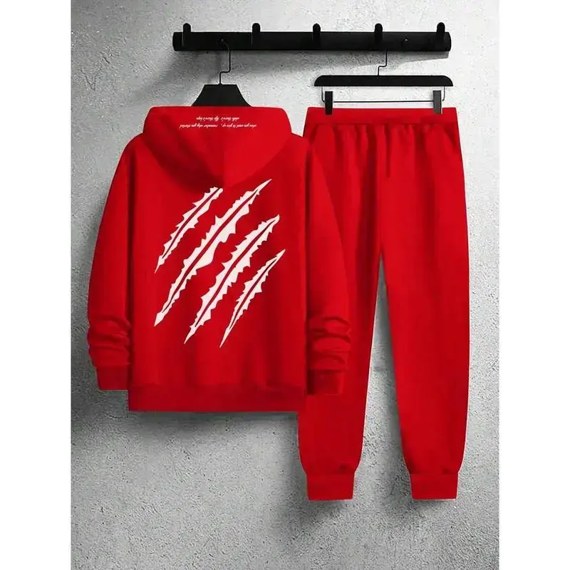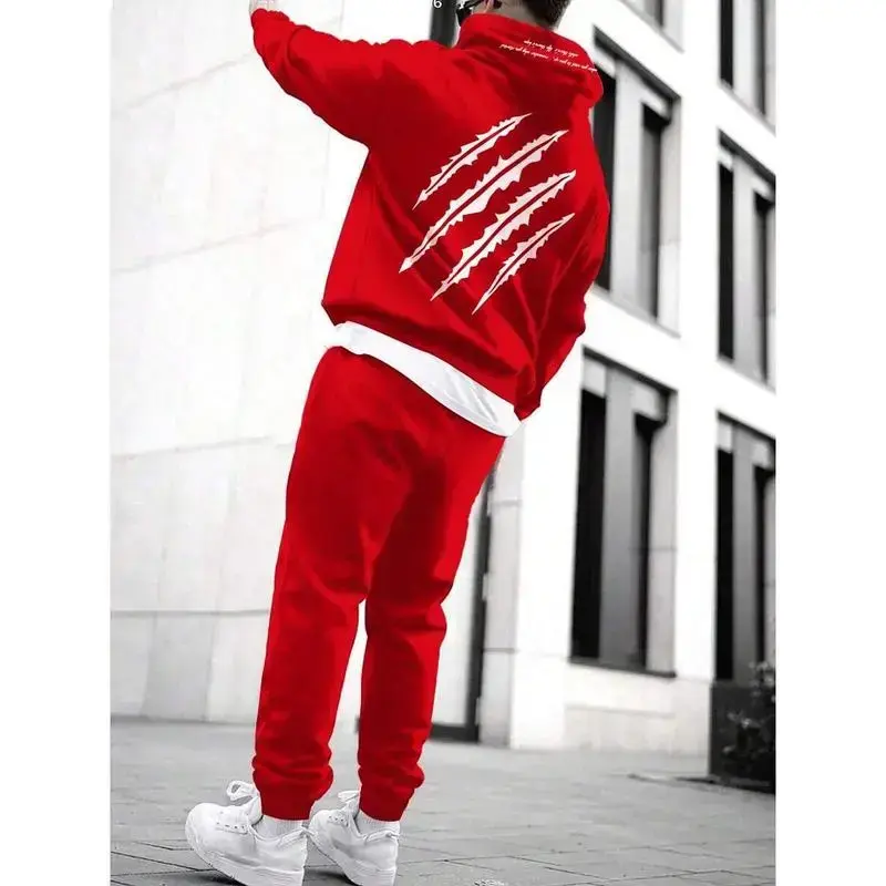 Men's two-piece grab print drawstring hoodie and sweatpants set, men's red two-piece sportswear set, men's hoodie and jogging suit set, red sportswear set, men's sportswear set