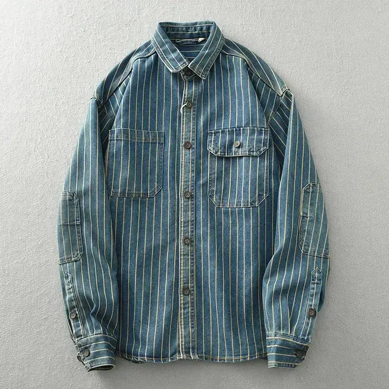 Heavy vintage washed vertical stripe denim shirt men's loose size cotton long sleeve shirt jacket Unique style Quality fabric Fathersdaygift Light Blue