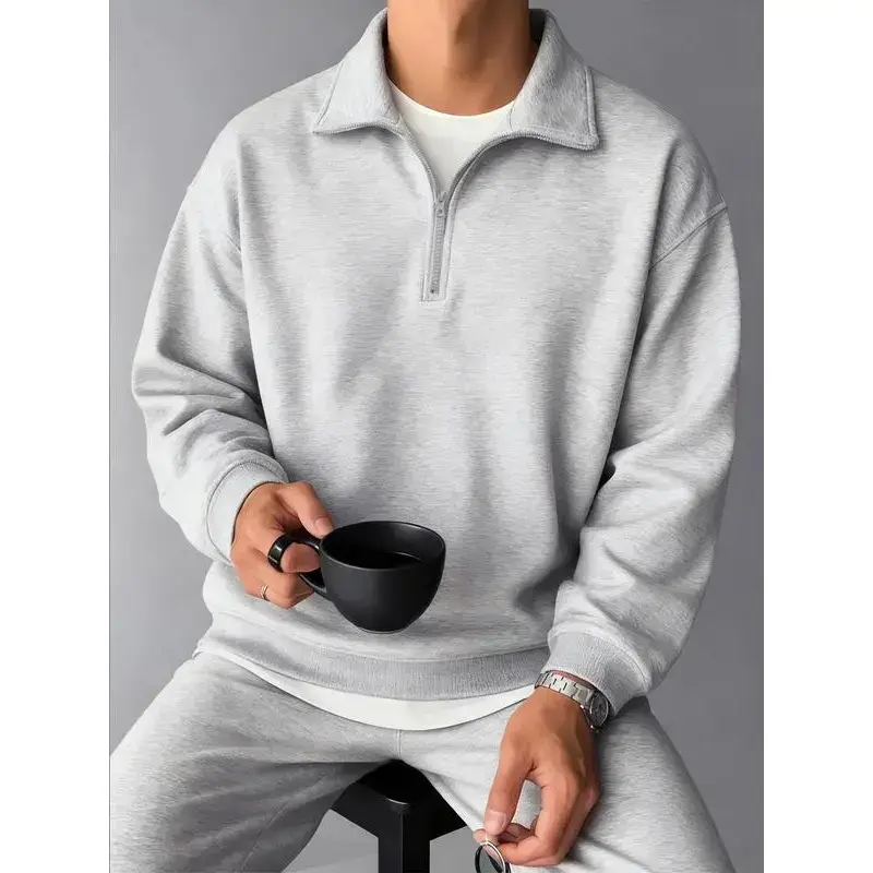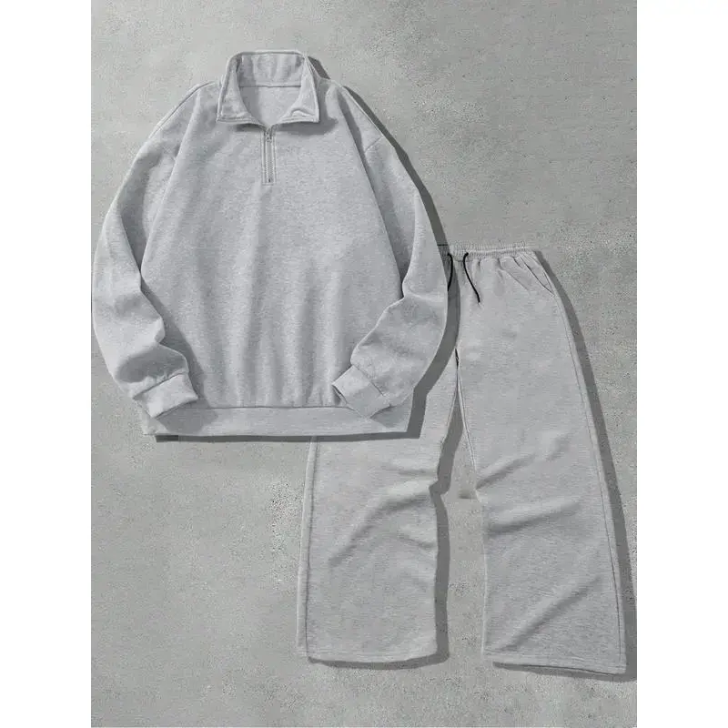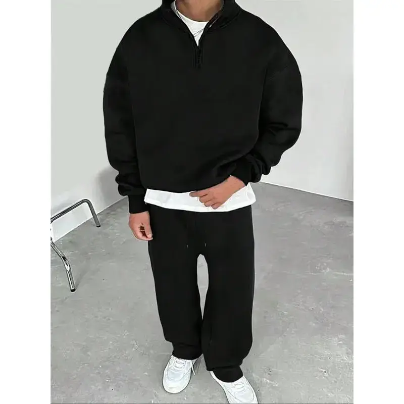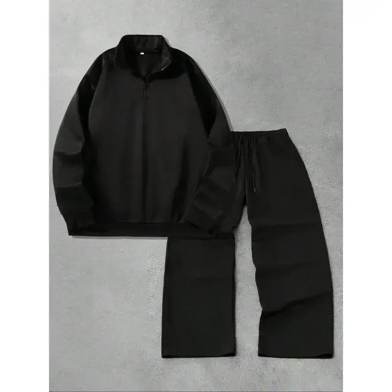 ??Relaxed Fit??: Featuring a loose fit in the long pants, ensuring an easy-going feel during wear. ??Convenient Half-Zip??: The half-open collar style offers ease of wear and ventilation, enhancing everyday use. ??Plain Aesthetic??: With a simple, solid color, this outfit is easy to mix and match with other wardrobe items. ??Seasonal Fit??: Designed for Fall and Winter, providing suitable coverage against cooler temperatures. ??Fitted Structure??: Designed with a fitted cut for the top, creating a tailored silhouette while maintaining ease.