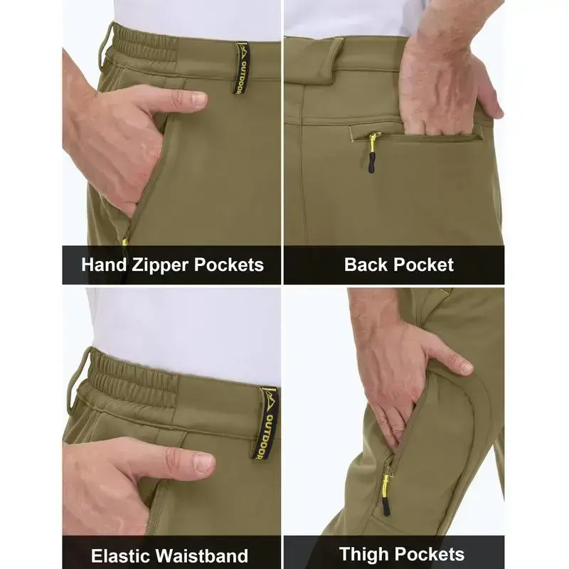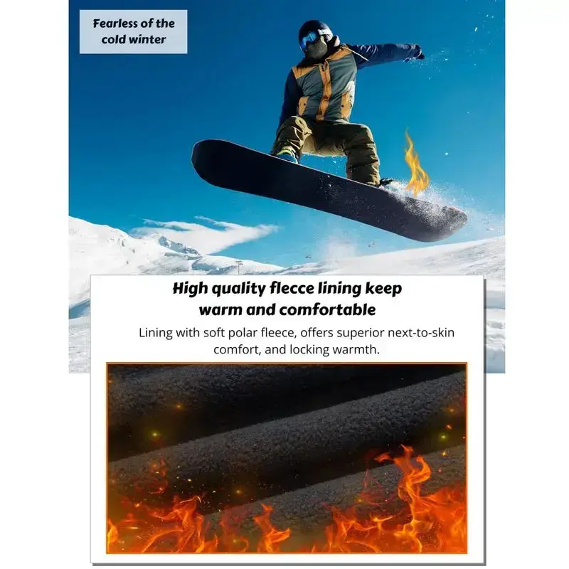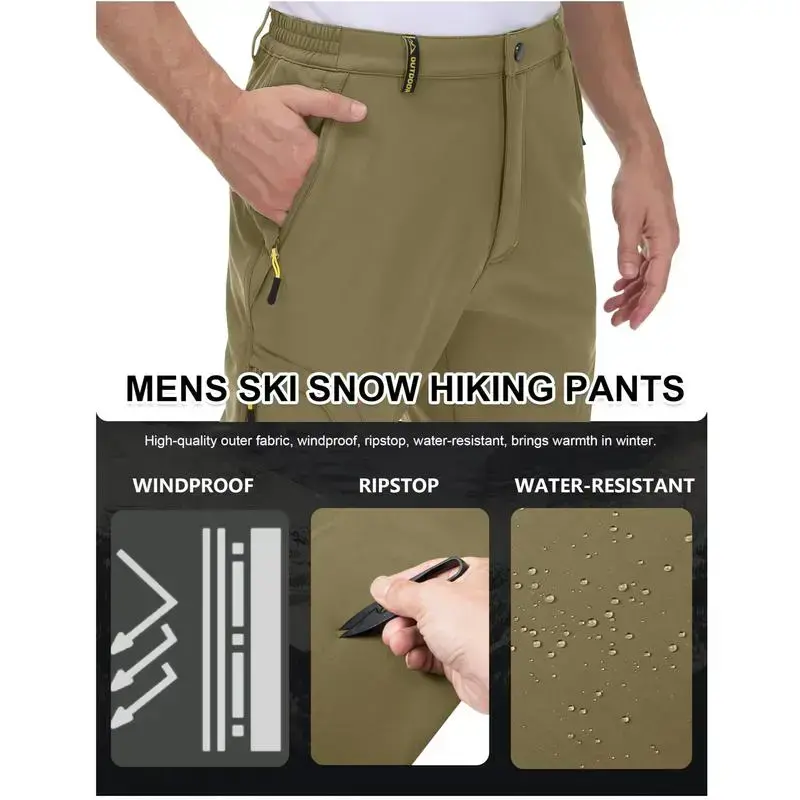 WARM & SOFT FABRIC: With 92% polyester and 8% spandex surface soft shell and pure polyester fleece lining, the snow pants for men can provide skin-like comfort to everyone who puts them on and improve thermal insulation performance to keep you warm WATER RESISTANT & RIPSTOP & WINDPROOF: The men's ski pants can keep you dry by preventing water absorption.The ripstop surface can handle with even the toughest user and keep you warm with windproof shield 5 ZIPPER POCKETS: The snow pants for men have 2 side roomy zipper pockets, 2 thigh zipper pockets and 1 right back zipper pocket.They can make your belongings safe and sound PRACTICAL DESIGN: With side elastic waistband, button closure, zipper, belt loops and straight leg cut, you can easily find a custom fit OCCASIONS: Wearing these mens snow pants, you can enjoy skiing, skating, snowboarding, hiking, travelling, walking, camping, fishing, climbing, running and casual daily wearing outdoor in cold winter