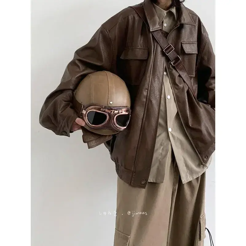 2025 Japanese retro and cool PU motorcycle leather jacket, loose neutral brown leather jacket Womenswear Coats flight jacket Tops Outerwear Long Sleeve Style Unisex Fashion