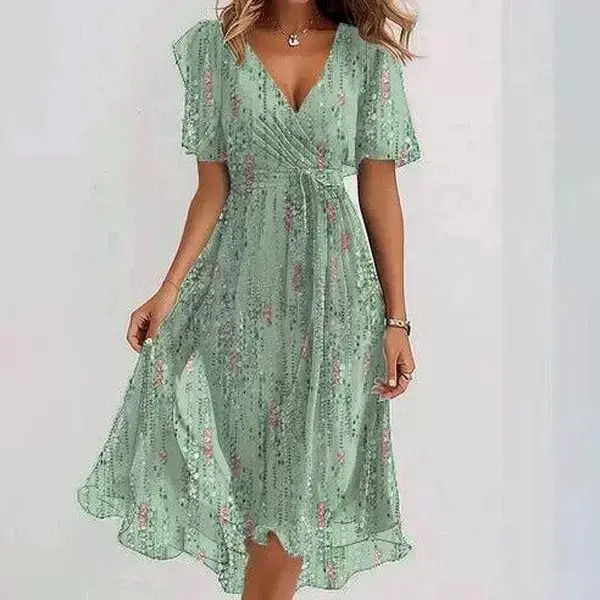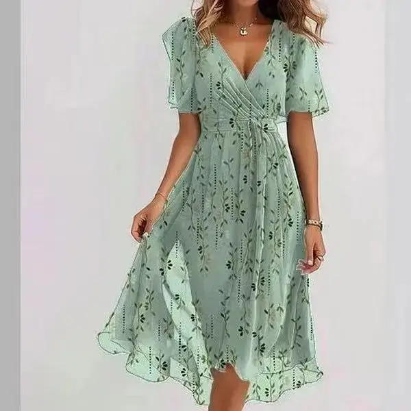 Printed women's dress elegant V-neck long dress ruffled floral skirt casual large size loose dress