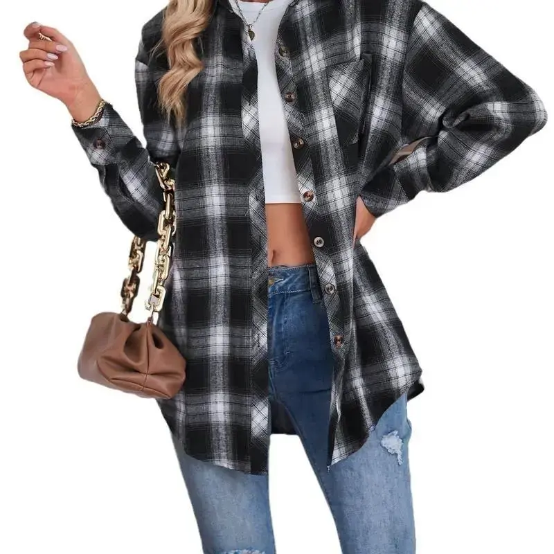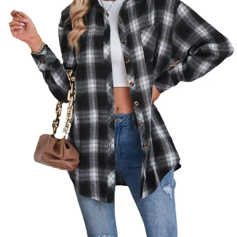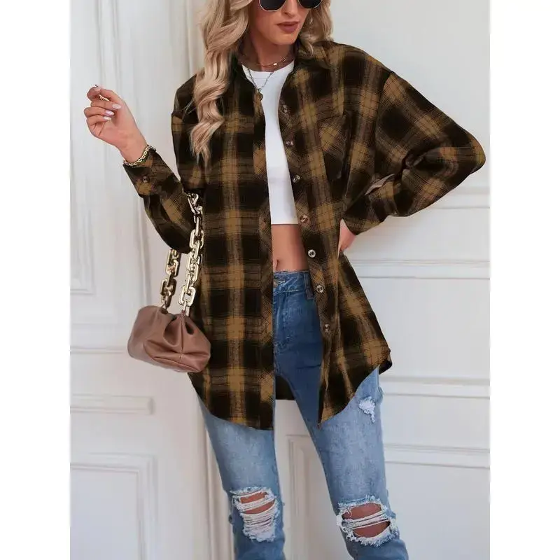 Womens Buffalo Plaid Flannel Shirt Long Sleeve Collar Button Down Blouses Tops