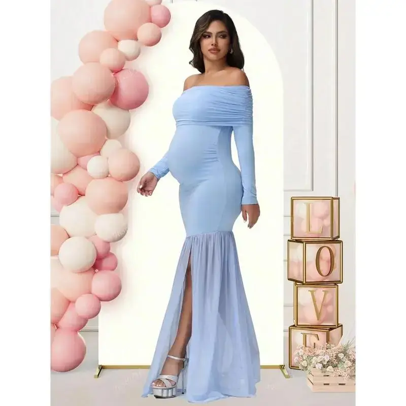 Maternity long sleeve off shoulder dress solid color mesh panelled split hem gown for baby shower photosparty party
