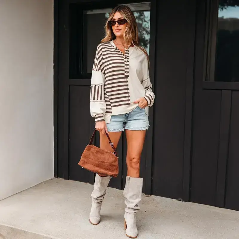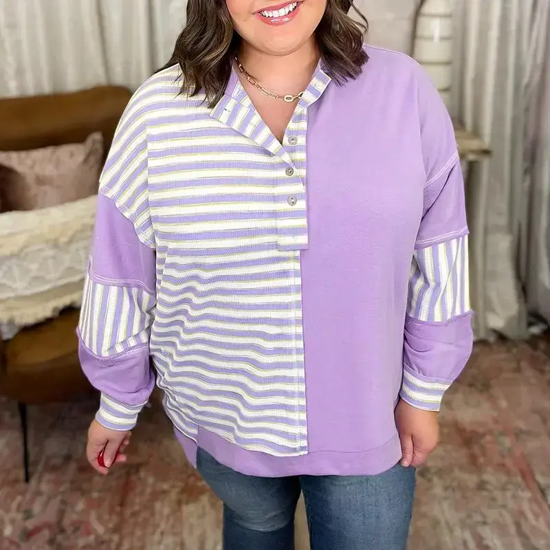 Women's Half Buttoned Drop Shoulder Plus Size Top Long Sleeve Striped Color Block Large Size Jumper