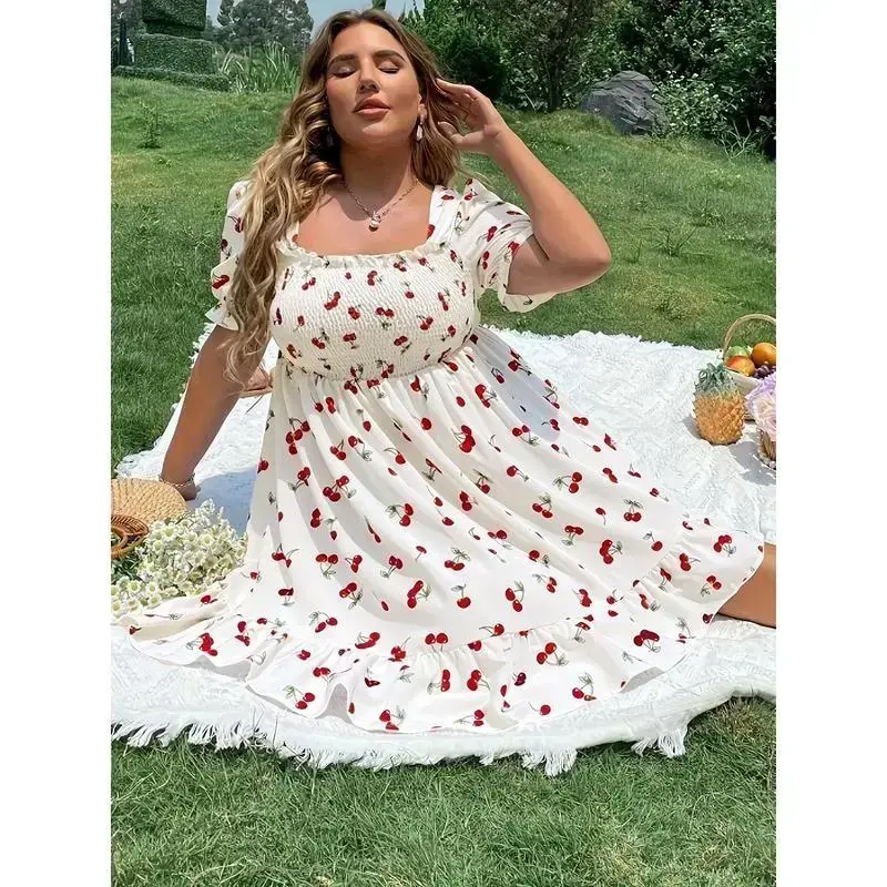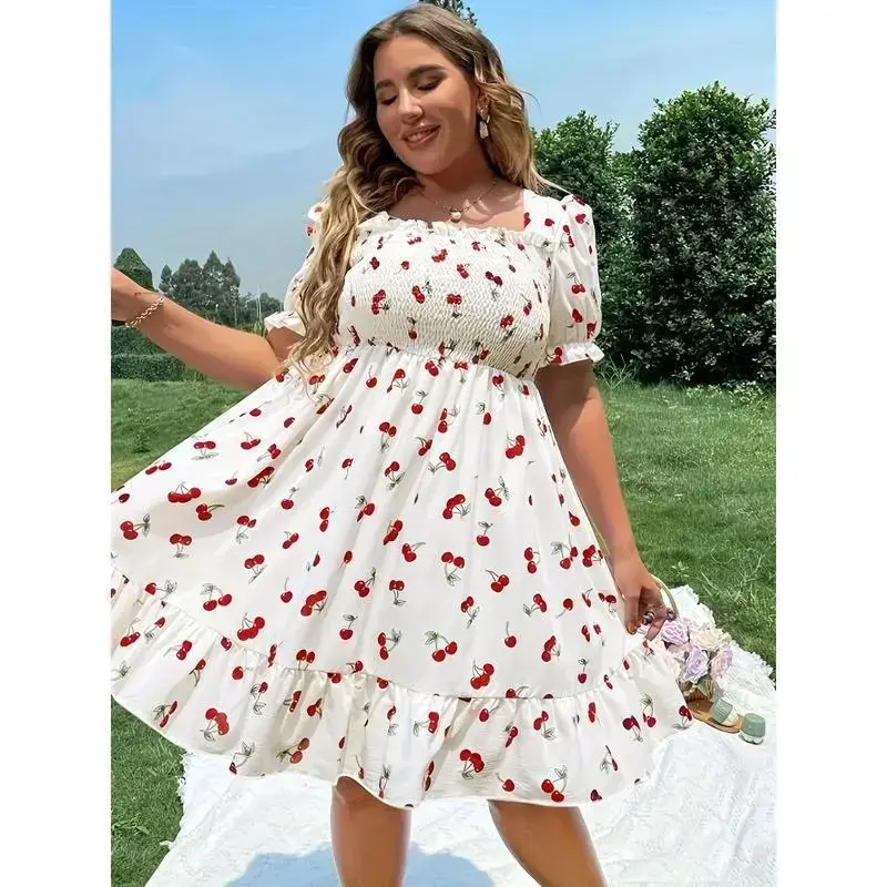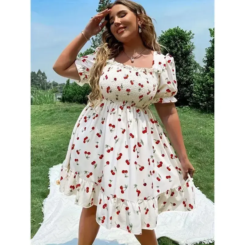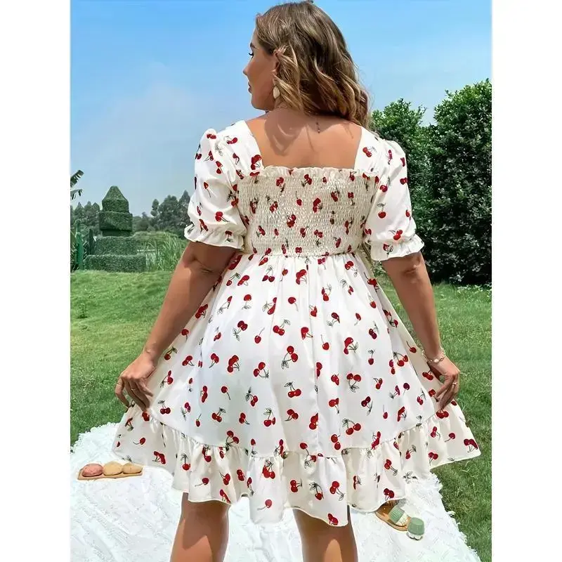 Plus Size Cherry Print Dress - Square Neck, Puff Sleeves, Ruffled Hem, A-Line, Casual Vacation, Machine Wash Polyester Shortsleeve Womenswear Loose