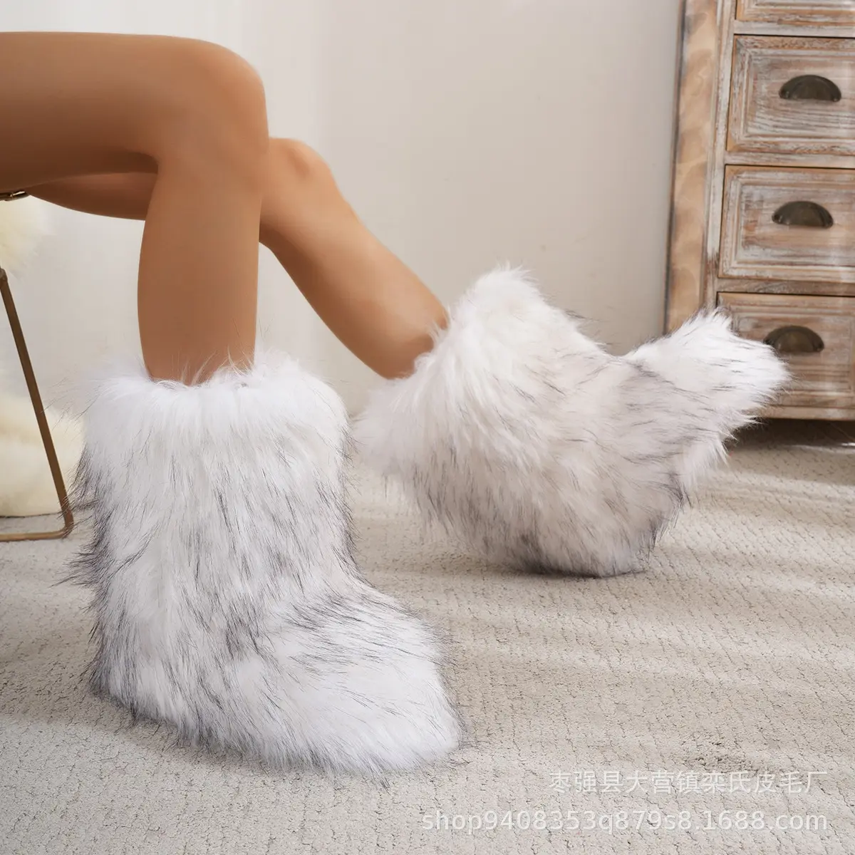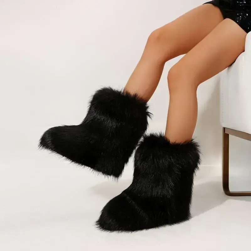 Snow Boots: These snow boots are made with a high-quality synthetic material sole, ensuring you won't have to worry about slipping while walking outdoors in winter.They are also highly wear-resistant.The outer layer and inner lining are crafted from premium faux , providing extra warmth and comfort. Elegant Design: Our women's faux boots feature smooth, They are durable and maintain their beauty even after long-term wear, combining aesthetics with practicality. Versatile Use: Wear these fuzzy boots in winter for warmth during work or daily activities, and even on snowy days.The thick faux keeps your feet warm in cold winters and remains breathable for comfort in hot weather.Pair them with shorts in summer for a sleek, slender look. Warm and Stylish:These boots have a soft, cozy lining and premium cotton insulation that wrap your feet in lasting warmth during cold winter days. Their unique design adds brightness to dreary winter scenes, enhancing your fashionable style.
