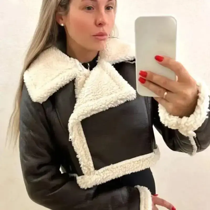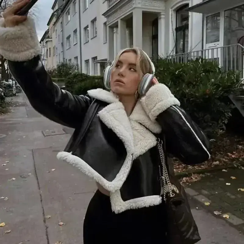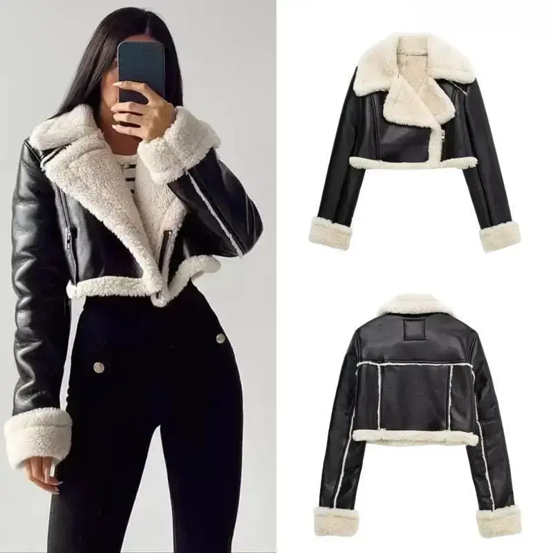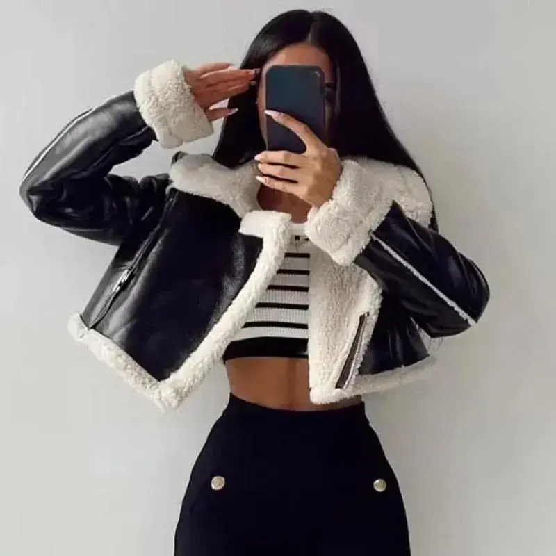 Women's Cropped Leather Jacket Coat Black Wool Blends Coats Bomber Tweed Jacket Autumn Winter Leather and Fur Crop Jacket