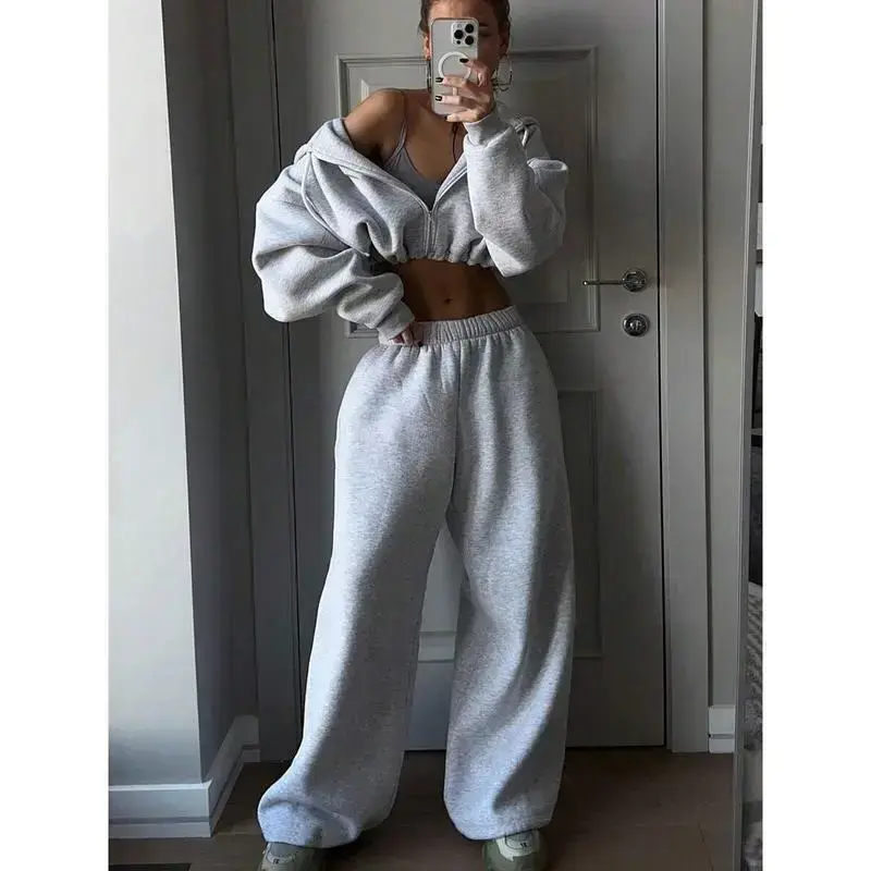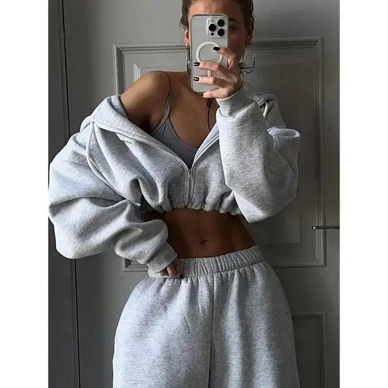 Plain Cropped Hoodie & Sweatpants, for Autumn/Winter Fall Wear