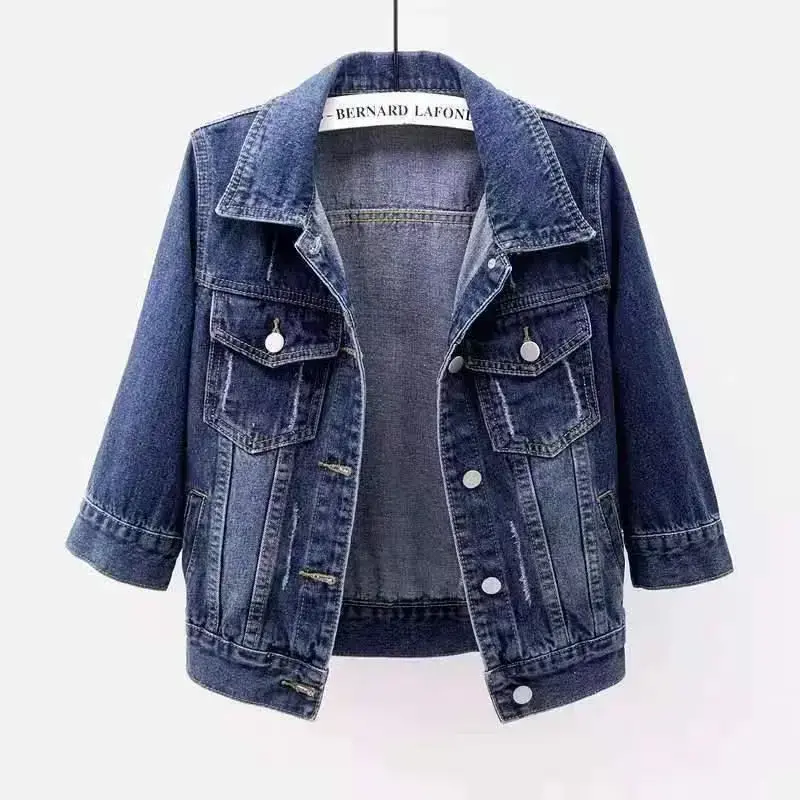Women Autumn 3/4 Sleeve Vintage Cropped Denim Jacket Light Blue Jean Coat