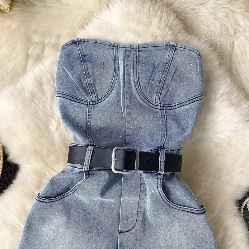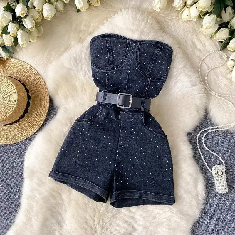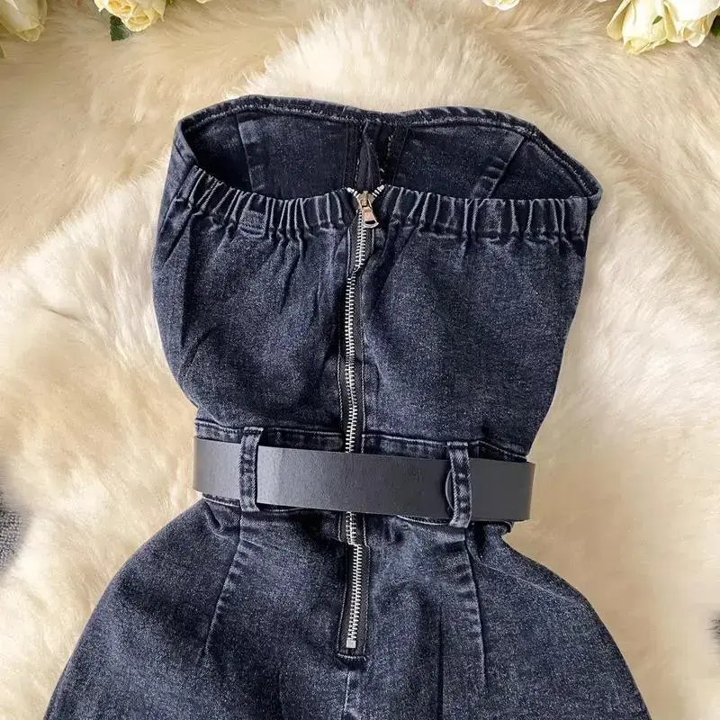 Women Denim one pieces Summer Fashion Drill High Waist Slim Sleeveless Strapless Sashes Outfits