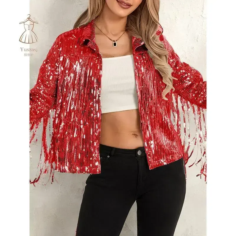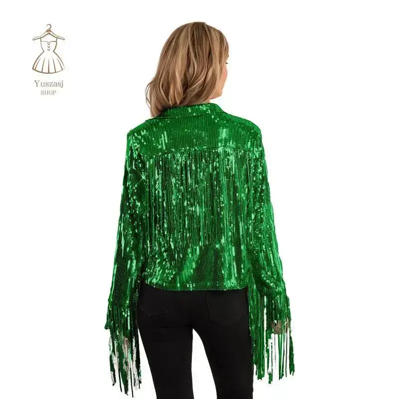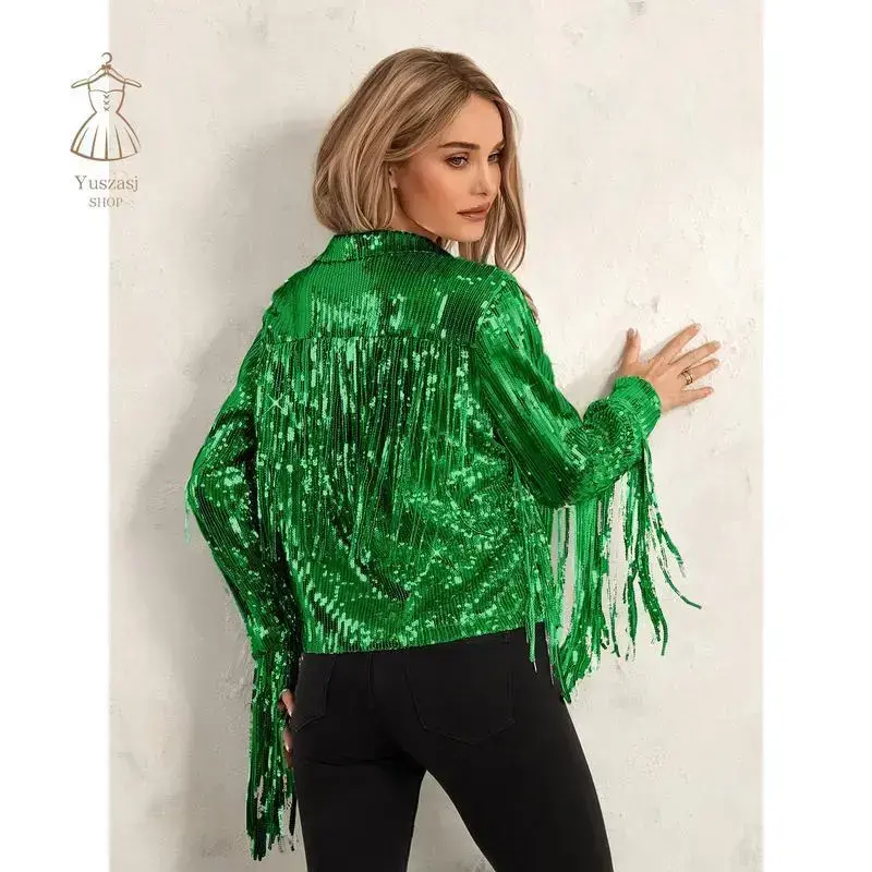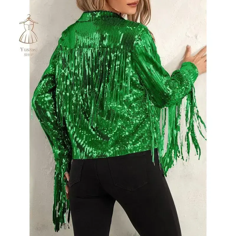 Women Disco Cowgirl Jacket Lightweight Casual Sequin Tassels Long Sleeves Cardigan Coat for Outwear Streetwear