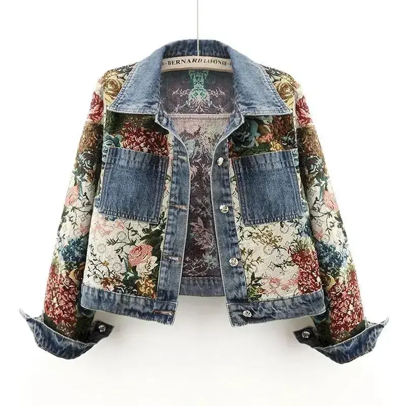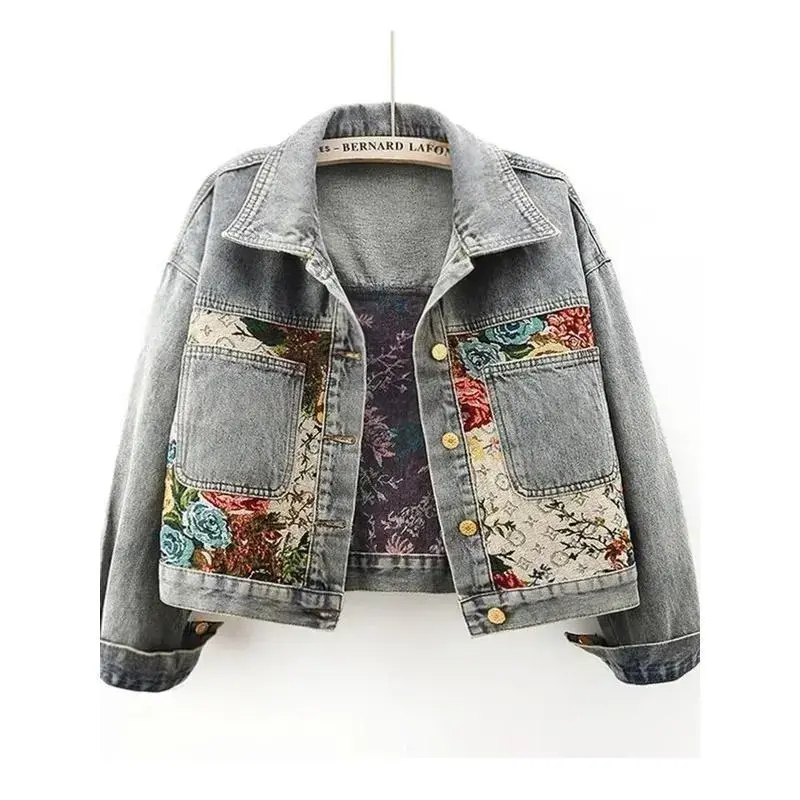 Fashion Jacquard Floral Embroidery Denim Jacket Women Slim Short Cowboy Outerwear Streetwear Big Pocket Cropped Jeans Coat