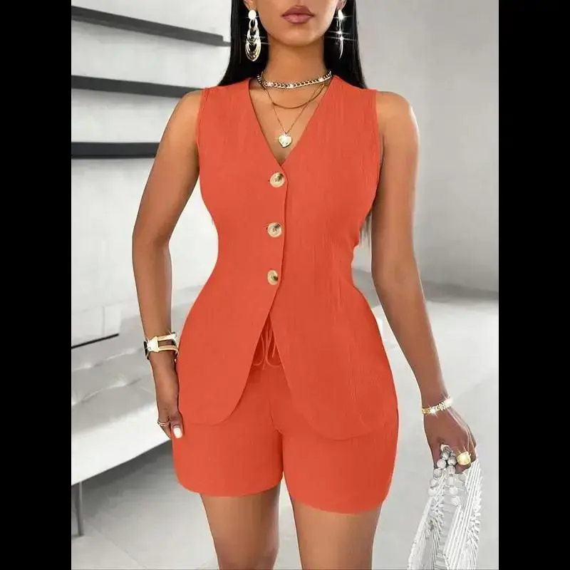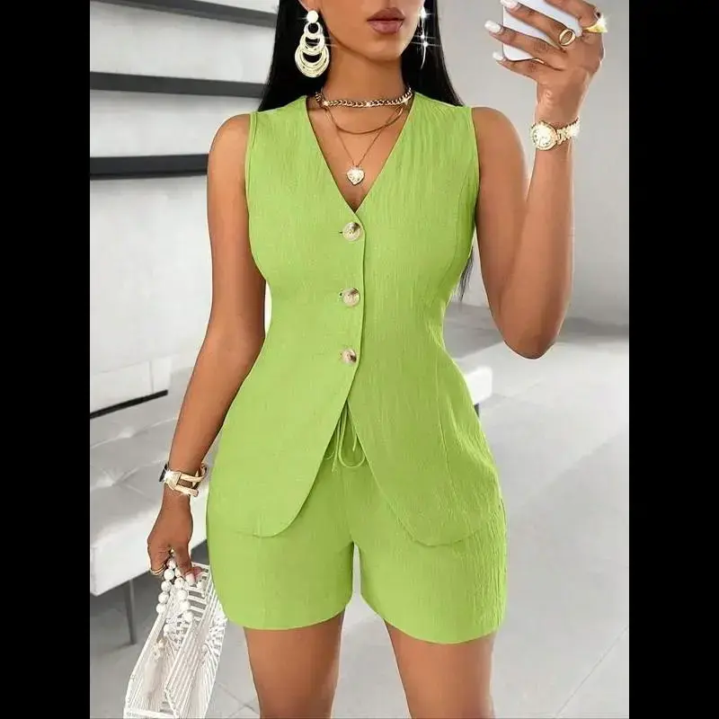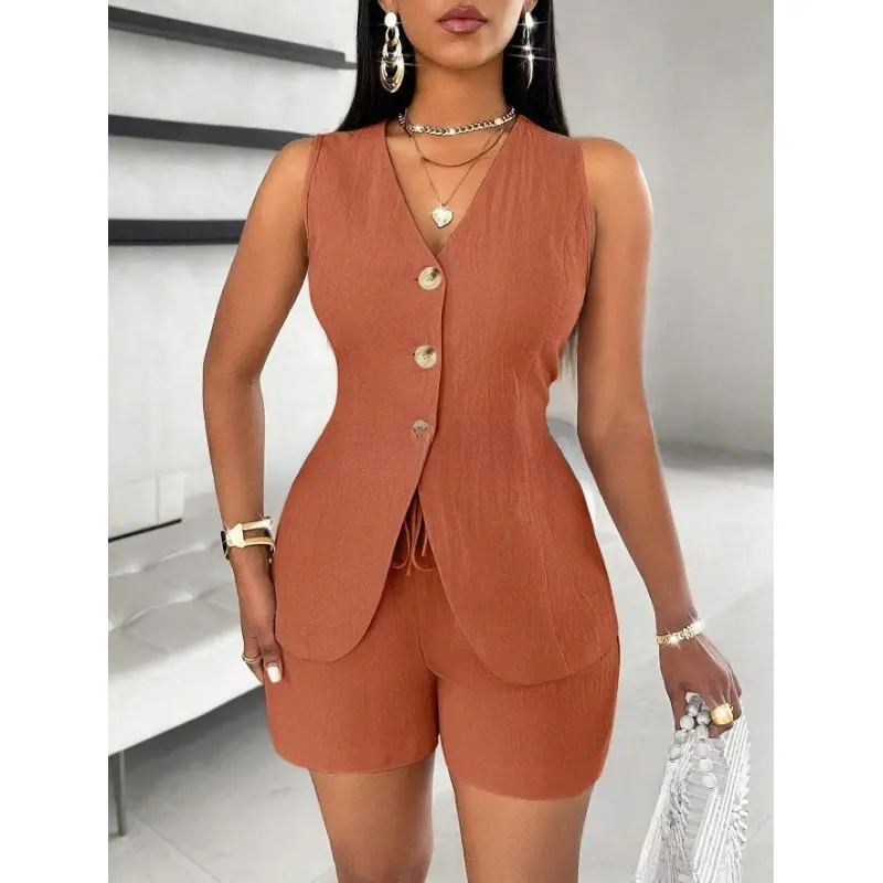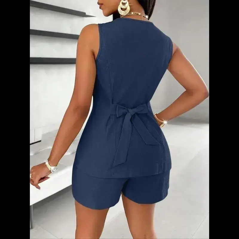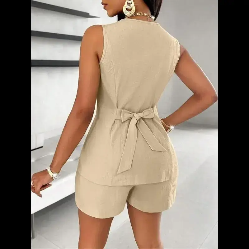 [Asymmetrical Hem]: The unique asymmetrical hem adds a modern twist, setting this vest apart from traditional styles in women's wear./[Bow Back Feature]: The charming bow back detail offers an eye-catching element, enhancing the overall appeal of this two-piece set./[Button Front Top]: Featuring a button front, this top ensures easy wear and adds a touch of sophistication to your outfit./[Natural Waistline]: Designed with a natural waistline, the shorts enhance the silhouette and provide a flattering fit for various body shapes./[Slim-fitting Cut]: The slim-fitting cut of this ensemble creates a sleek appearance, making it suitable for daily outdoor activities and gatherings./Attention/1. Due to the Display of Different Devices, the Color Will Be Slightly Different, Please Refer to the Actual Product./Refund Policy/1. Transportation Damage and Defects Can Be Compensated for Return and Exchange. Tariffs and Freight Must Be Paid for Subjective Reasons./2. If You Need to Return the Product, Please Keep the Package Intact and Keep the Product Brand New./Contact Us/If You Have Any Questions about Our Products, Please Contact Us. We Will Help You Solve Them Within 24 Hours./Hope We Can Bring You a Good Shopping Experience!