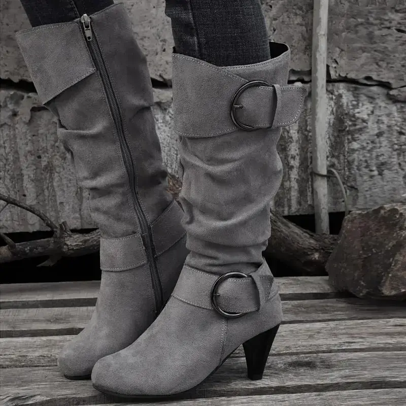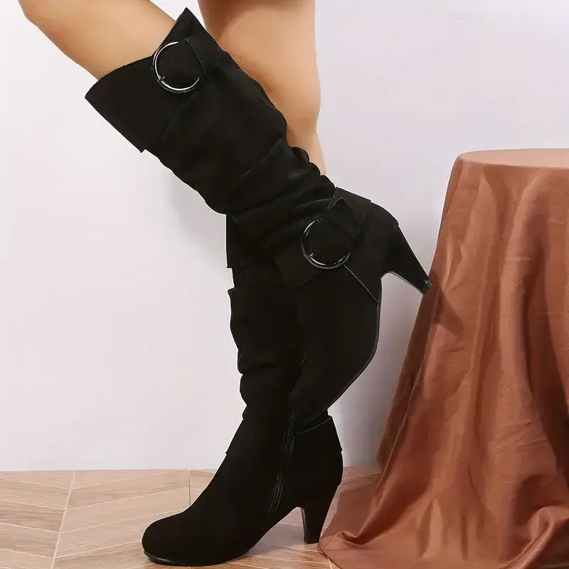 Women's Slouch Knee Boots, Strap Side Zipper Heeled Boots, Comfortable Suedette Long Boots