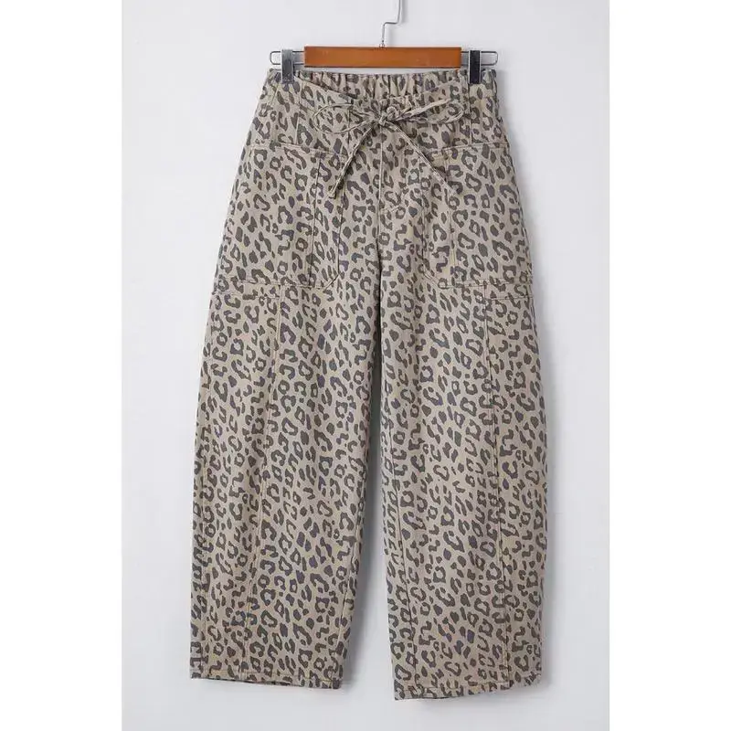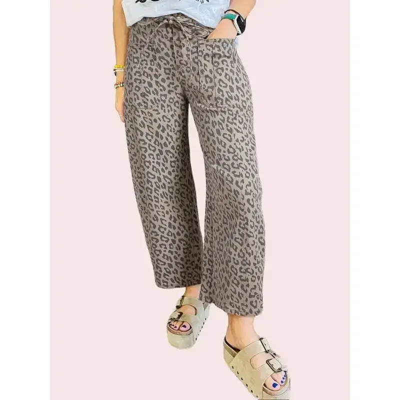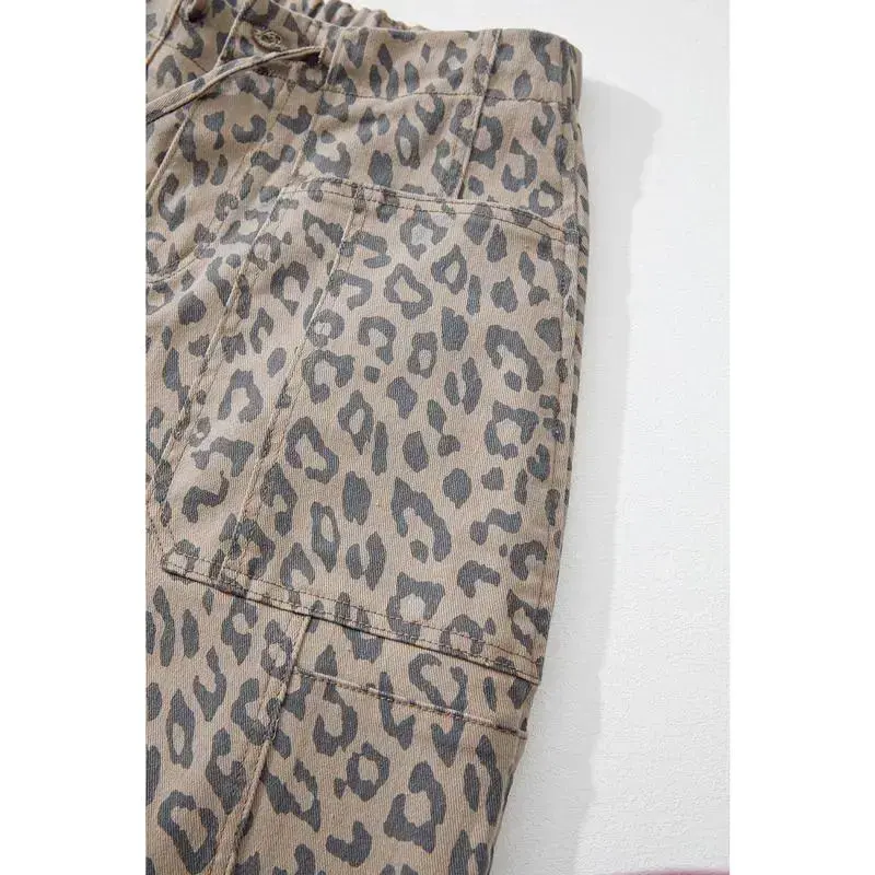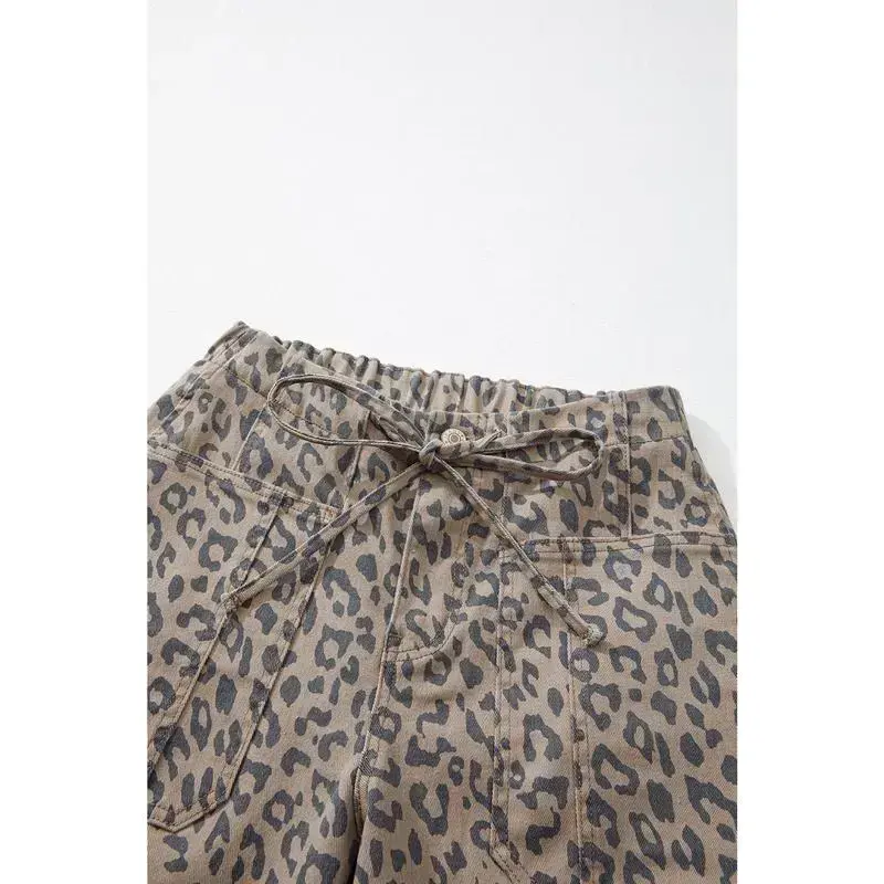 Women's Khaki Leopard Print Wide Leg Jeans with Drawstring Waist and Pockets for Everyday Wear