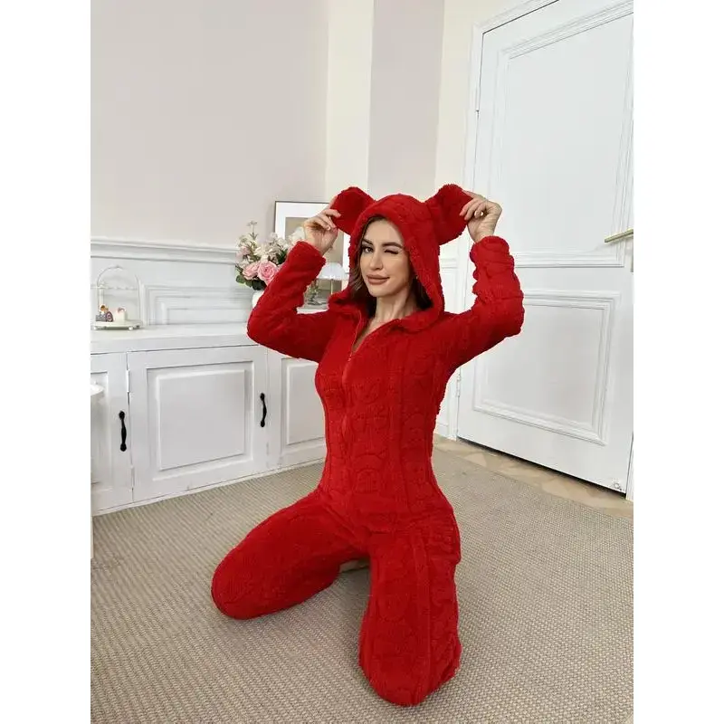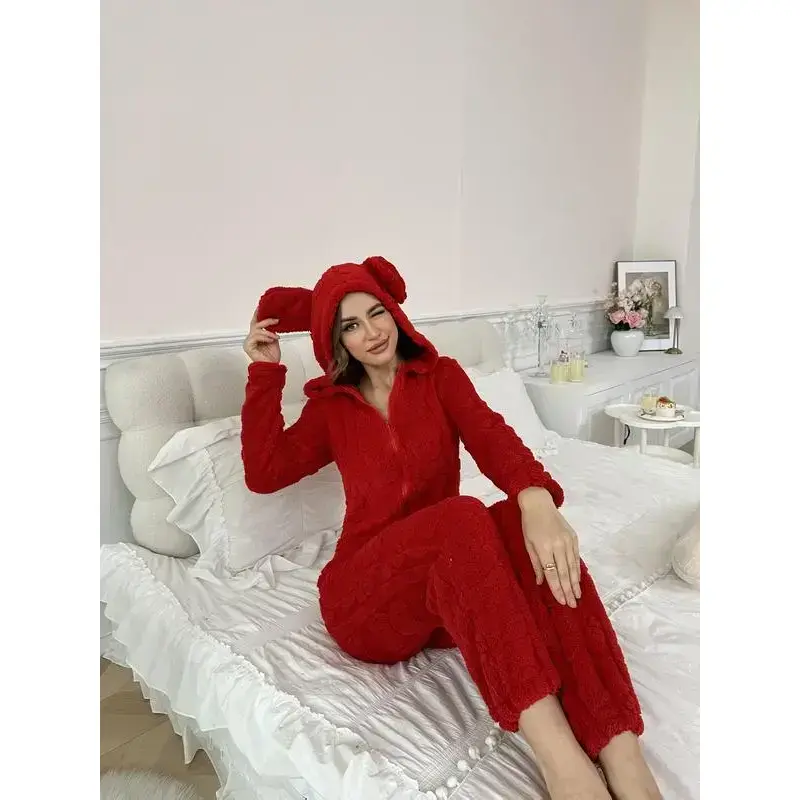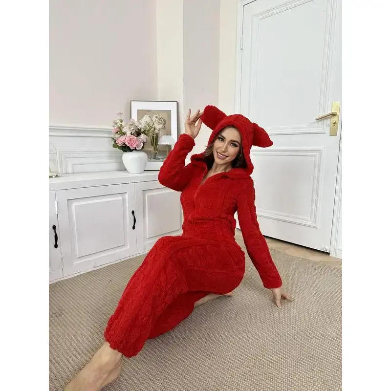 【Unique Features】: The 3D rabbit ear design adds a whimsical touch, making this jumpsuit standout in any loungewear collection. 【Thick Fabric】: Crafted from thick material, this jumpsuit ensures warmth and coziness during the colder fall and winter months. 【Fitted Type】: Designed with a fitted silhouette, it offers a flattering look while maintaining ease of movement for daily activities. 【Convenient Zipper】: Equipped with a front zipper, this garment provides easy wear and removal, adding practicality to its design. 【Seasonal Use】: Specifically tailored for fall and winter, making it essential for keeping warm during chilly evenings at home.