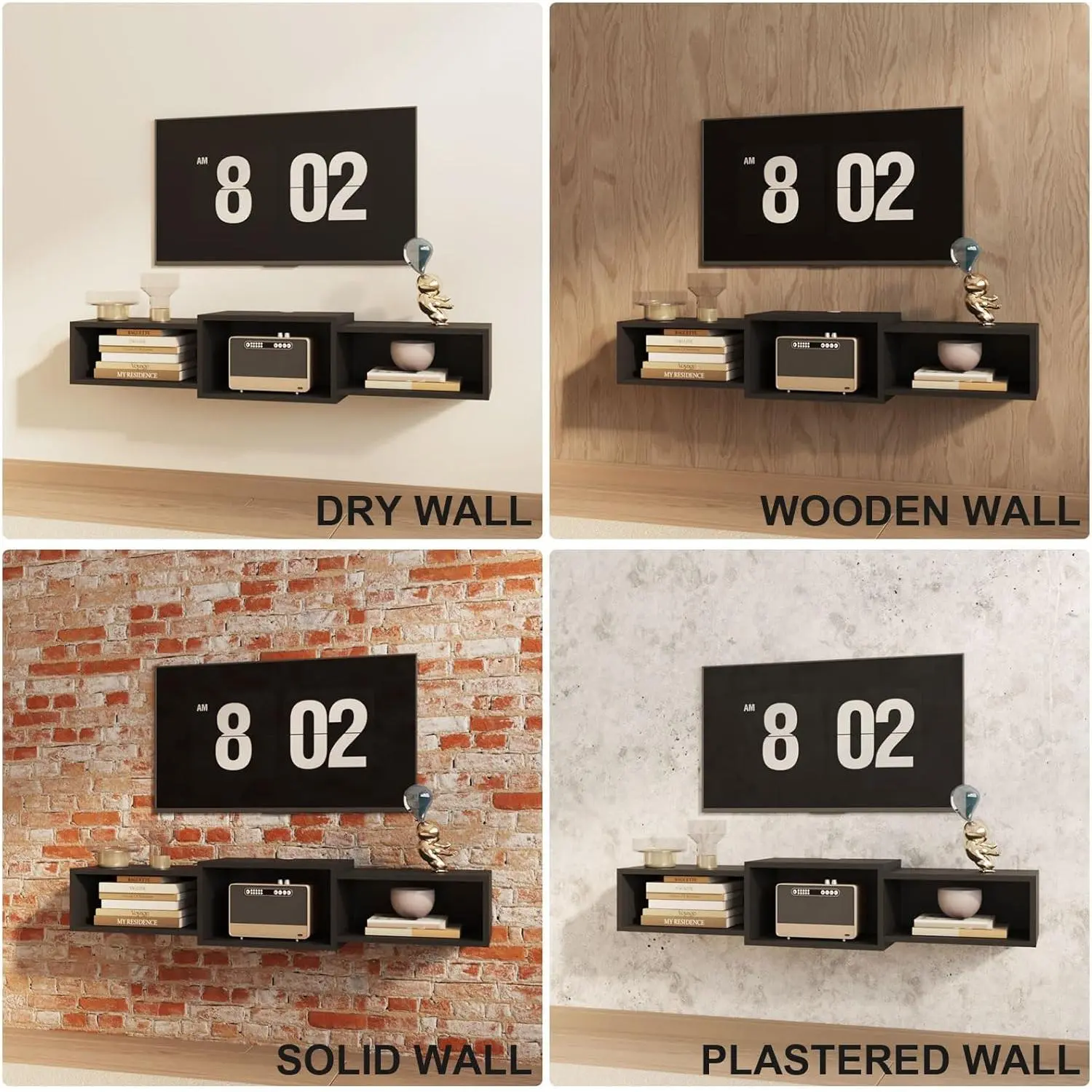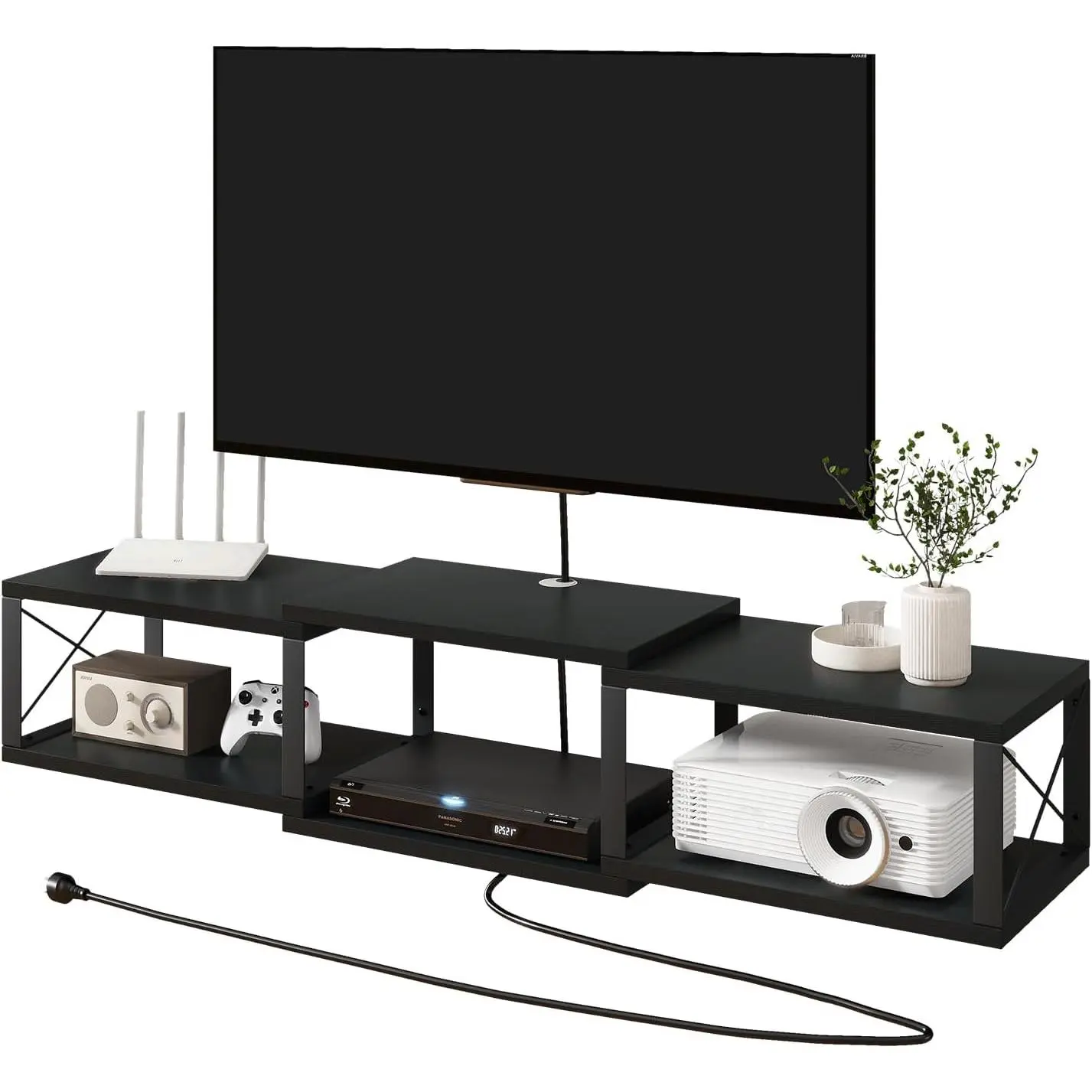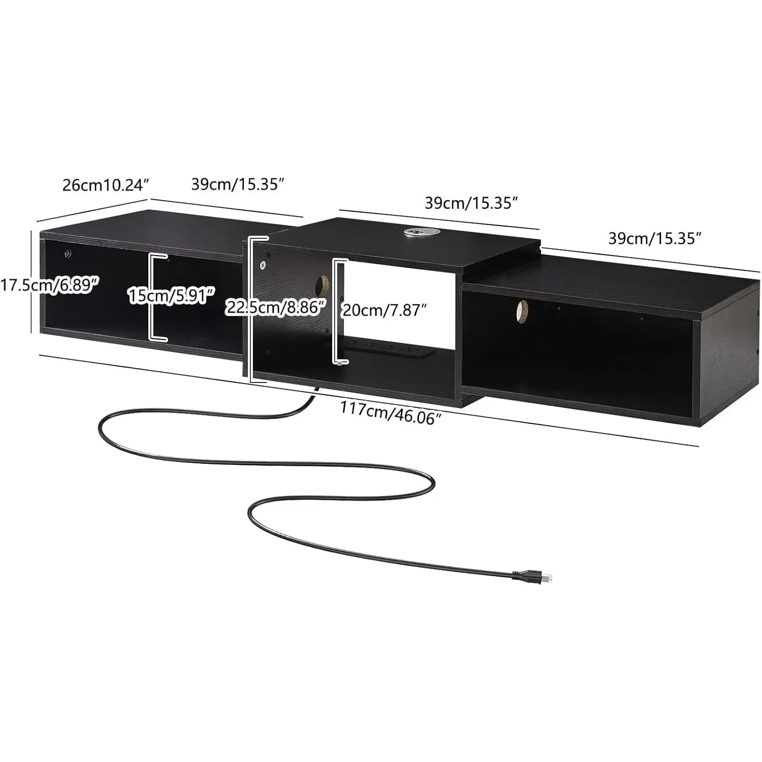 Wall-mounted floating TV cabinet with power outlets, modern wooden wall-mounted media console, floating entertainment center for storage under the TV in the living room, bedroom, or office, black