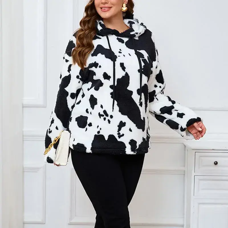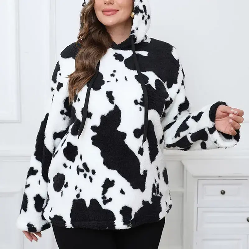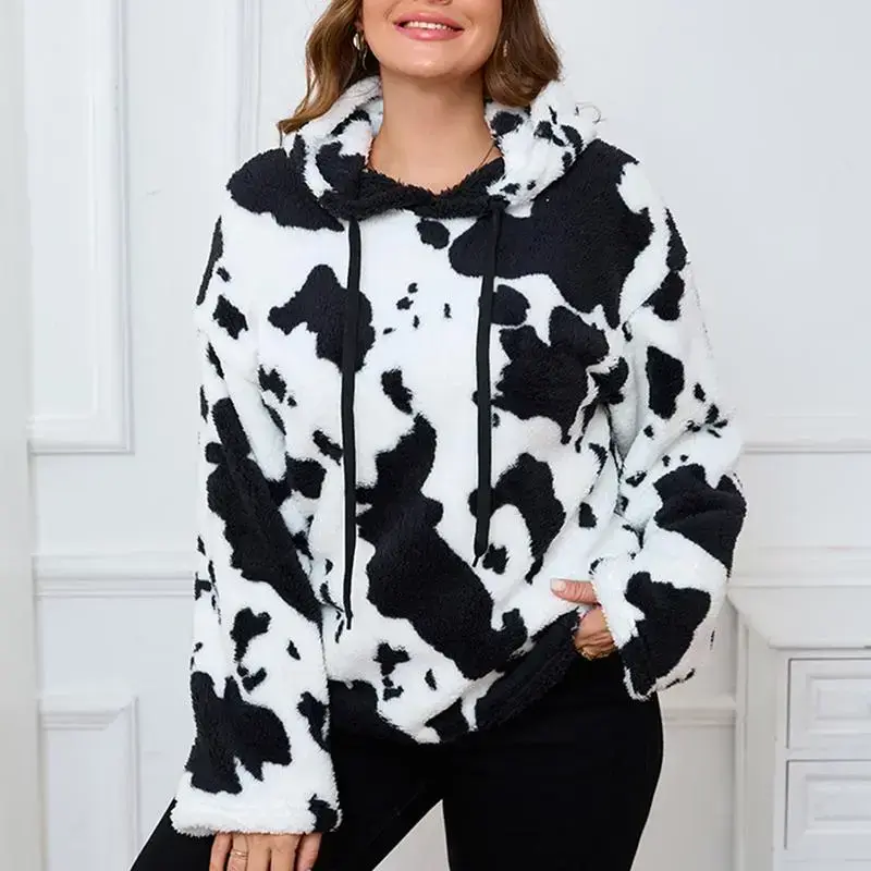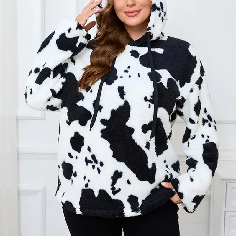 Women'sWinterPlushHoodedSweatshirtLongSleeveCowPrintLooseDrawstringHoodie,LadiesClothesforIndoorOutdoorWear,LadiesClothesforDailyWear