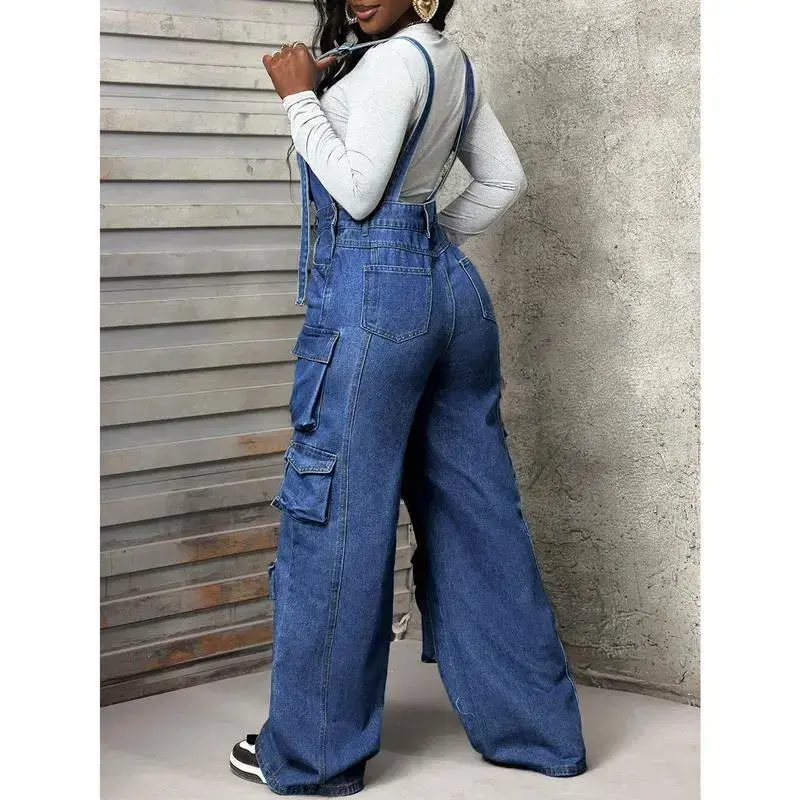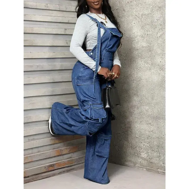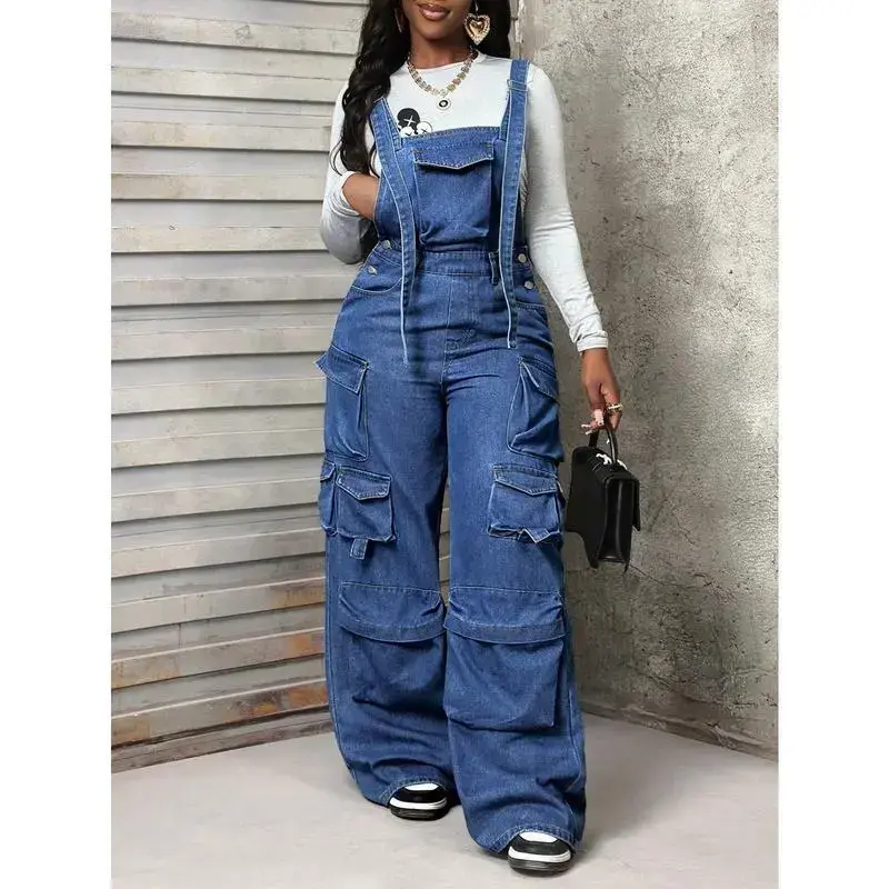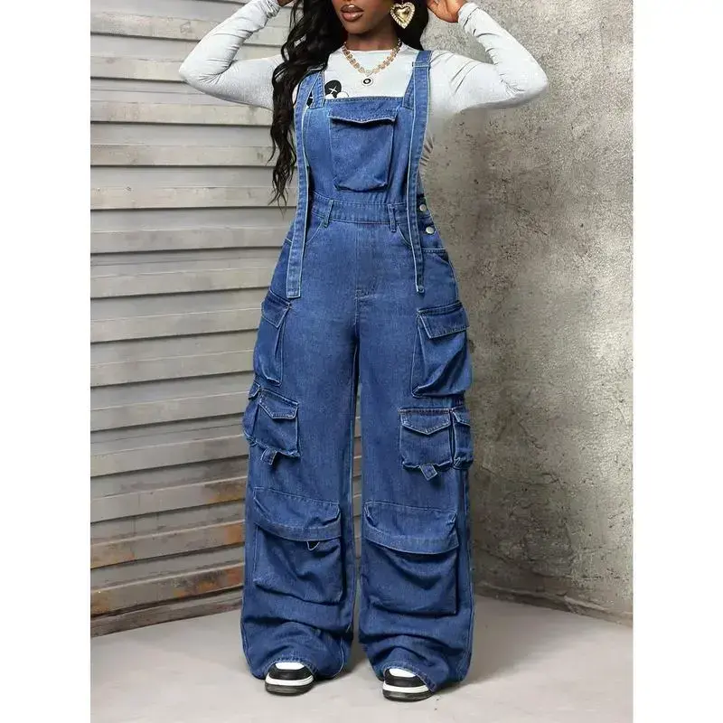 Women's Spring Autumn Multi-Pocket Casual Loose Denim Bib Pants Oversize Womenswear Overalls Blue