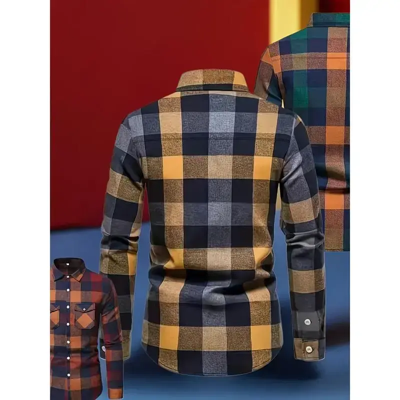 3pcs Men'S Plaid Shirt Set, Long Sleeve Casual Button-Down with Lapel Collar and Chest Pockets, Polyester 100%, Non-Stretch Woven Fabric, Regular Fit for Spring/Fall - Red, Blue & Black Combo Pack