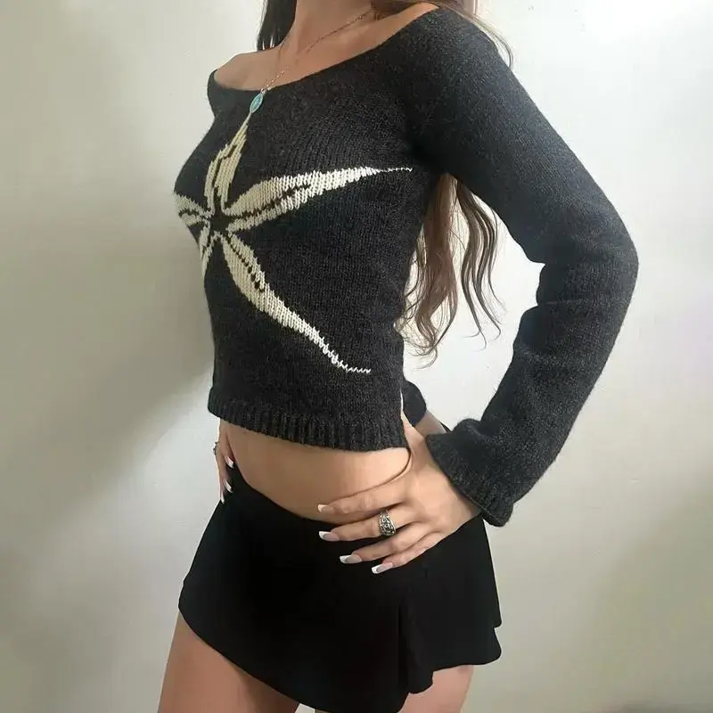 Y2K Aesthetic Off Shoulder Crop Sweater for Women Long SleeveFit Graphic Knit Pullover Tops Vintage Streetwear Knitwear Womenswear