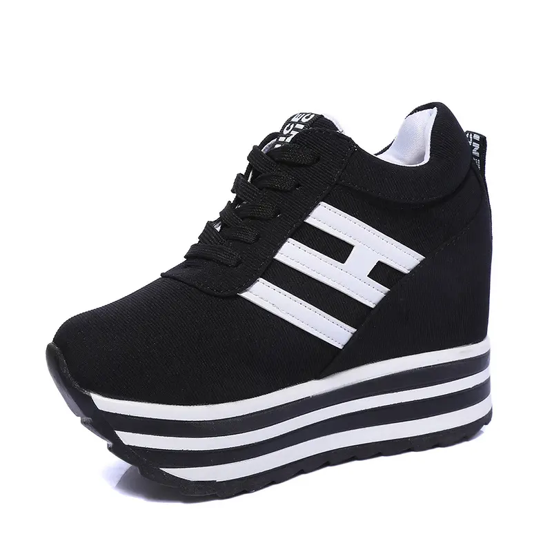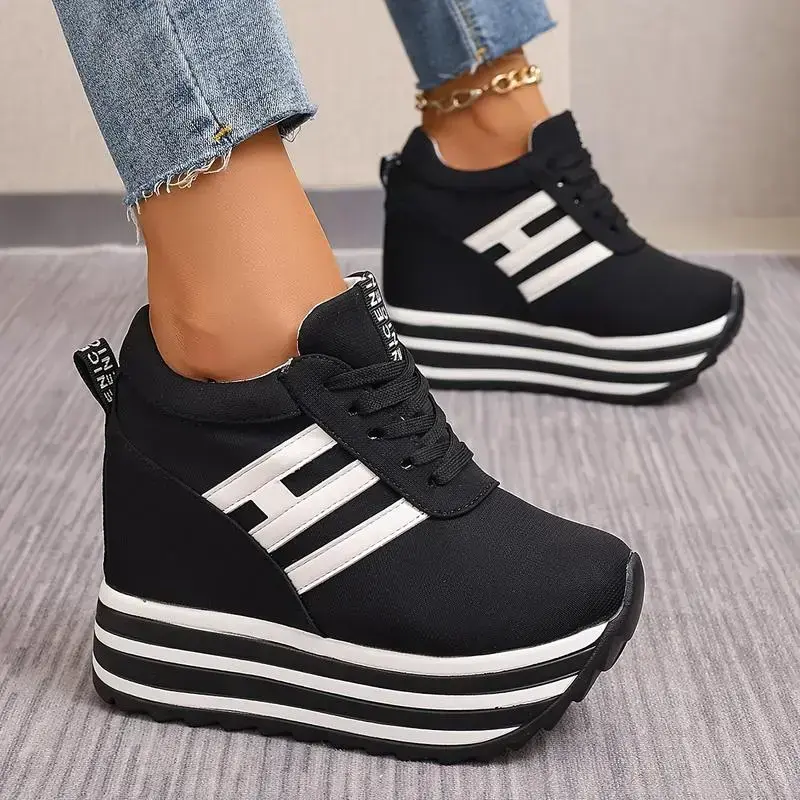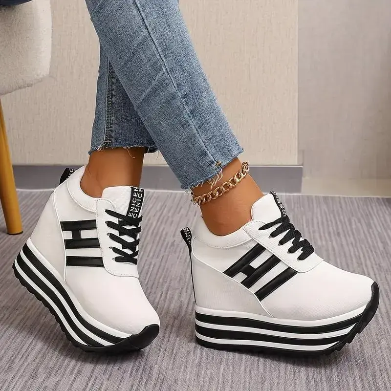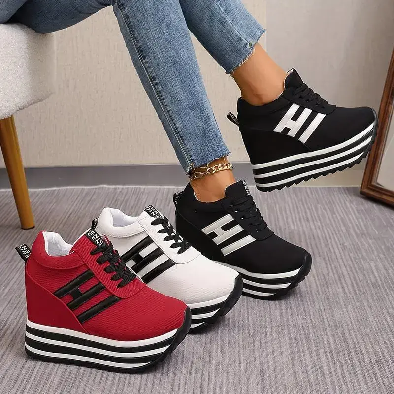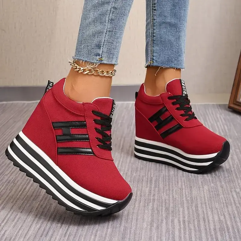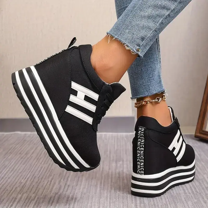 Women's Fashion Wedge Sneakers - 3.94inch Height Increasing, Lace-up Canvas Shoes Thick Sole Suitable for All Seasons