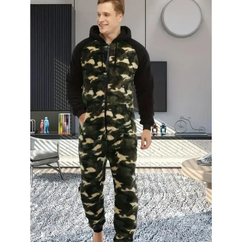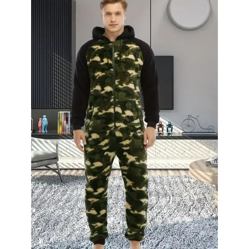 【Women's Day】 Men's Camo Novelty Print Hooded Drawstring One Piece Pajamas Long Sleeve Fabric Casual Loungewear