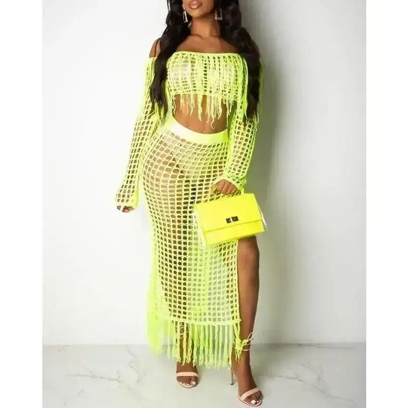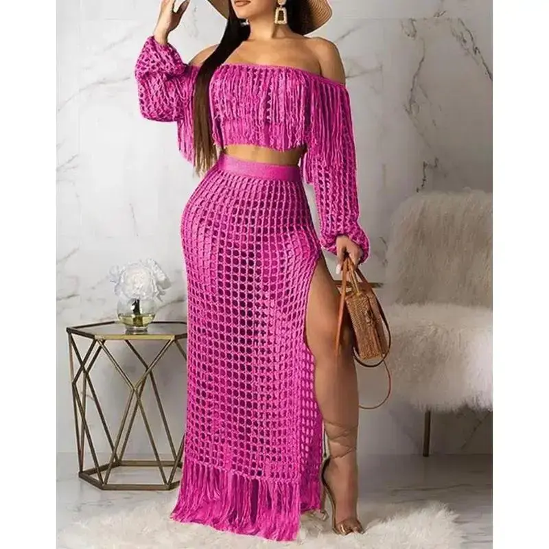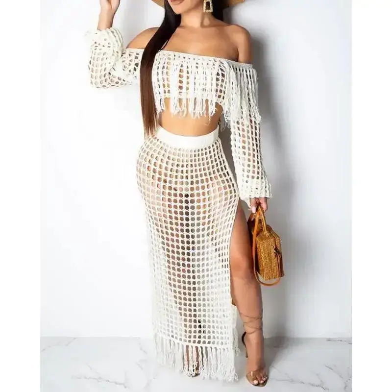 Women Swimsuit Summer Fashion Crochet Casual Mesh Tassel Off The Shoulder Long Sleeve Beach Top & Skirt Sets Swimwear Cover-Ups