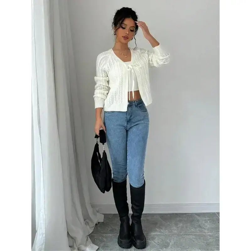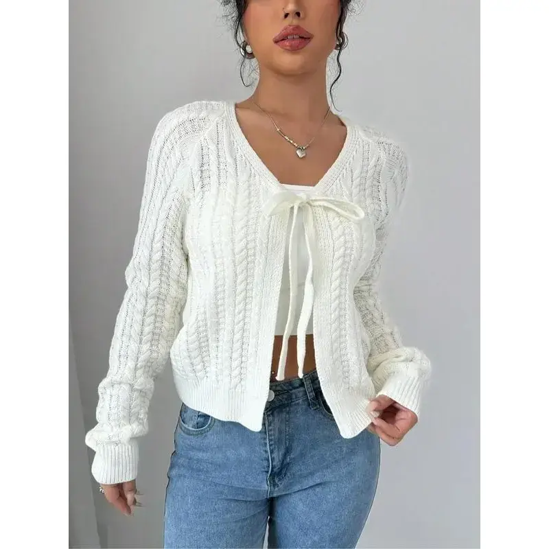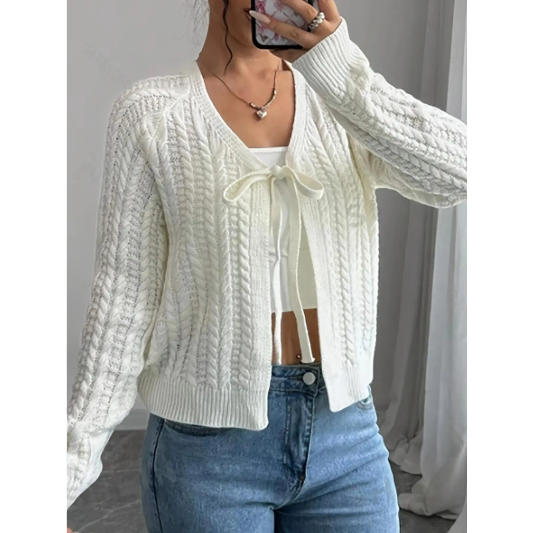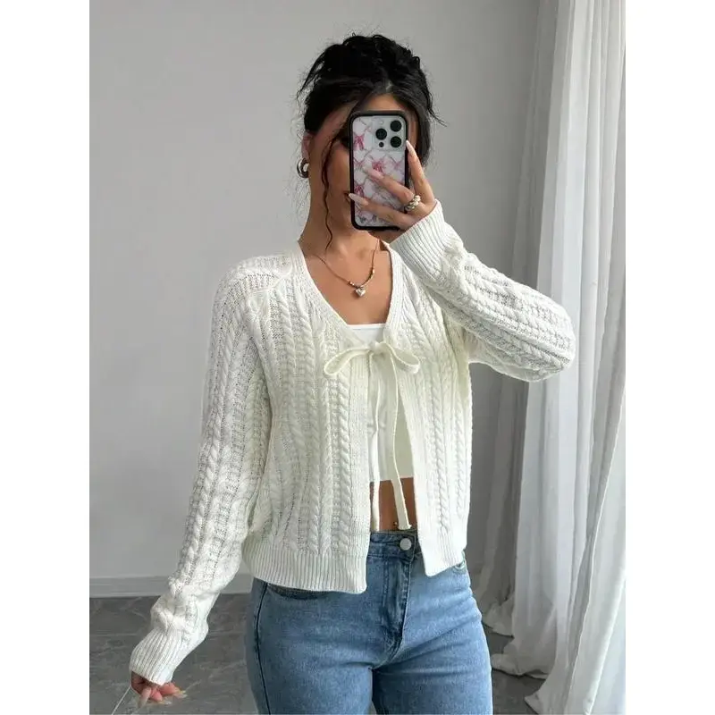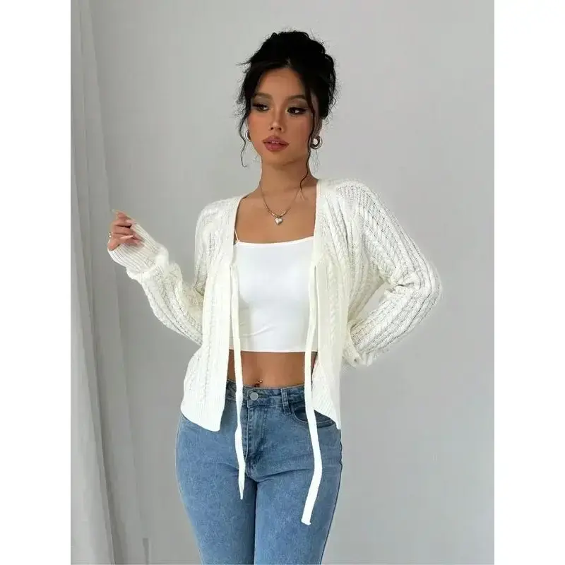 Women's Solid Tie Front Sweater Cardigan ✨ Elevate your casual wardrobe with this Women's Solid Tie Front Raglan Sleeve Sweater Cardigan. Perfect for Spring & Fall, this cardigan is a versatile addition to your daily wear. 🌸 Casual Long Sleeve Design