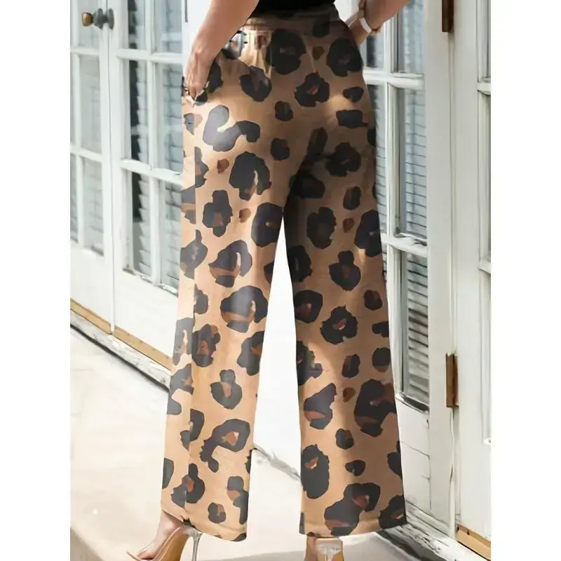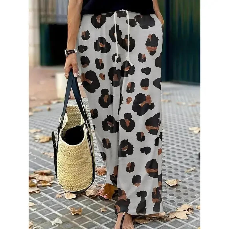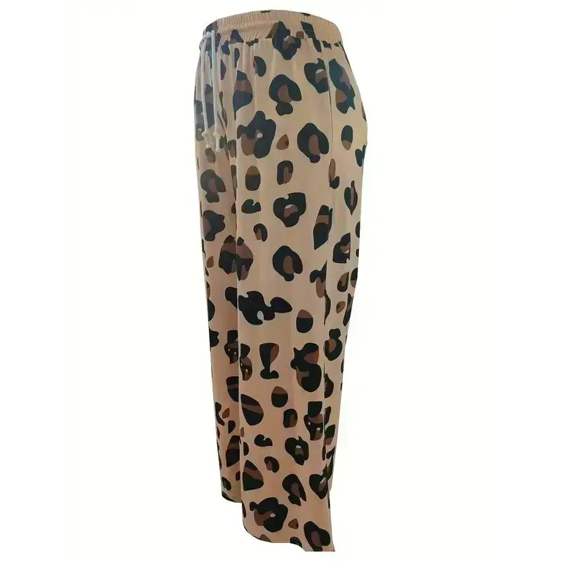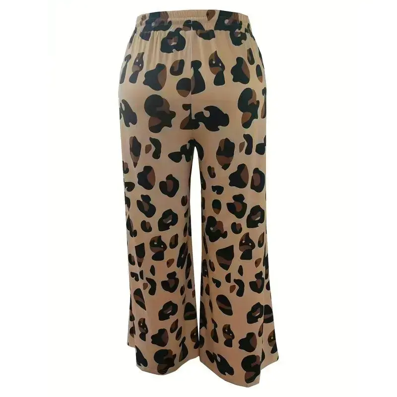 Women's Plus Size Wide-Leg Pants with Leopard Print, Elastic Drawstring Waist, and Pockets - Machine Washable