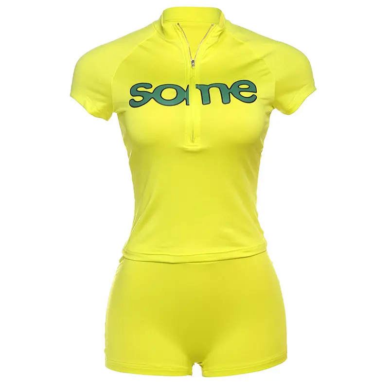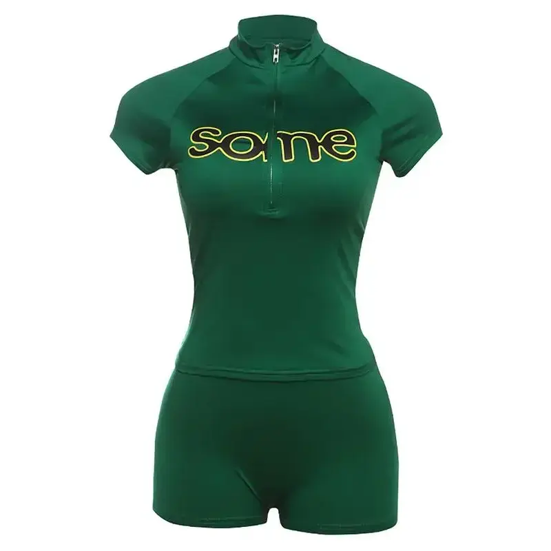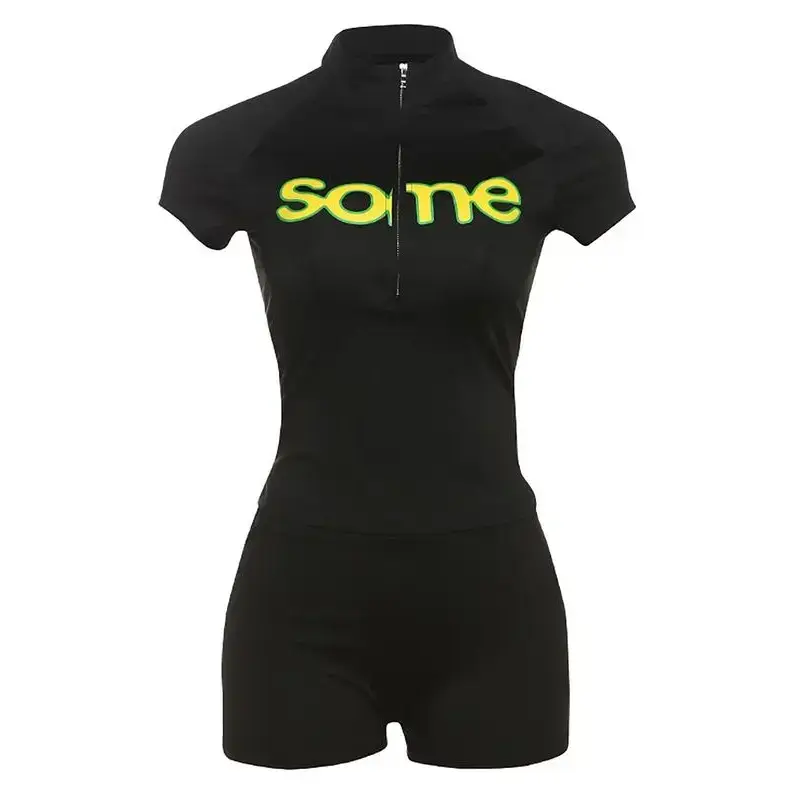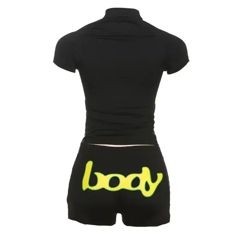 Women's Slim Letter Print Shorts 2 Piecs Set, Street Style Digital Print Slim Fit Zipper T shirt + High Waist Shorts Suit, Casual Fashion for Daily Wear Spring + Summer(gift) Clothes Womenswear