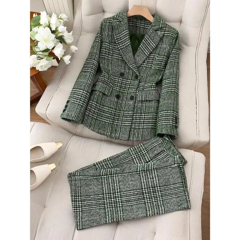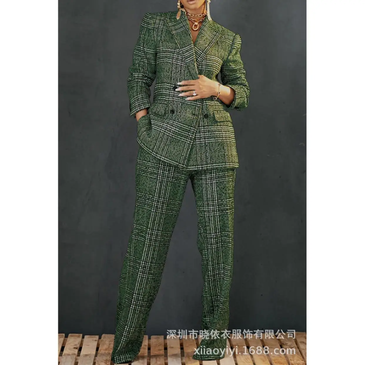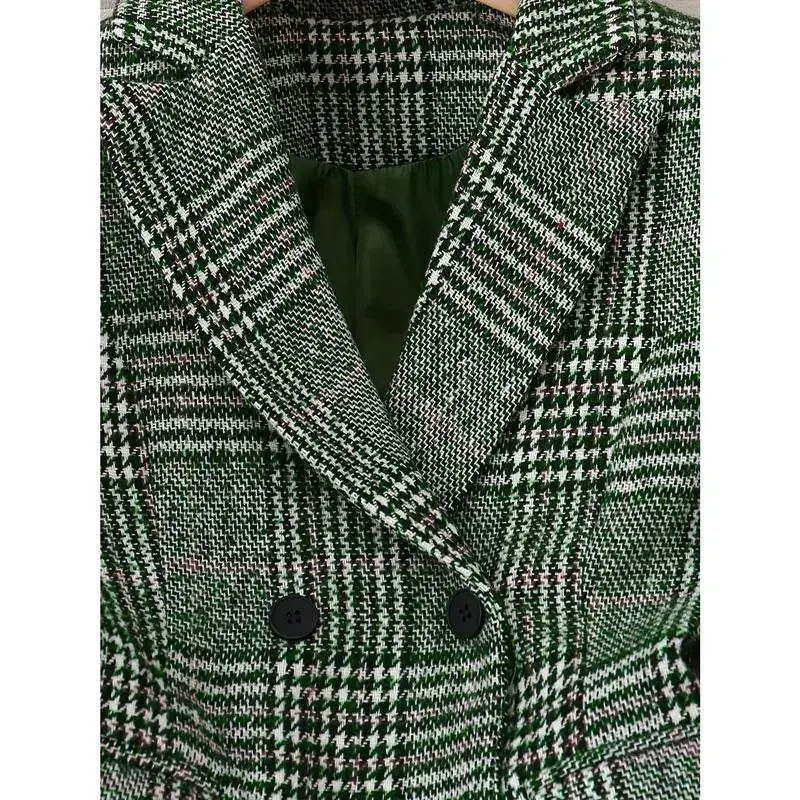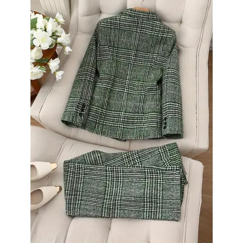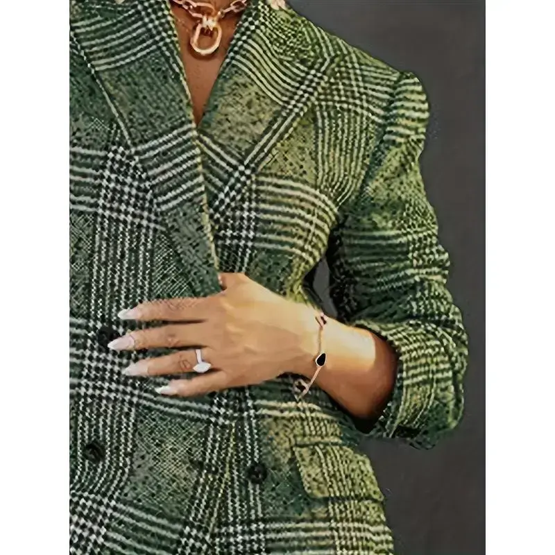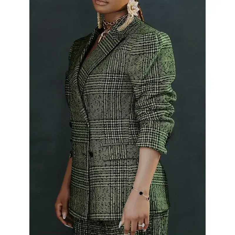 Elegant Plaid Blazer Suit - Green Double-Breasted Blazer Suit Set, Notched Lapel, Pocket Detail, Regular Fit, Women's Casual Wear Fabric Womenswear Collar