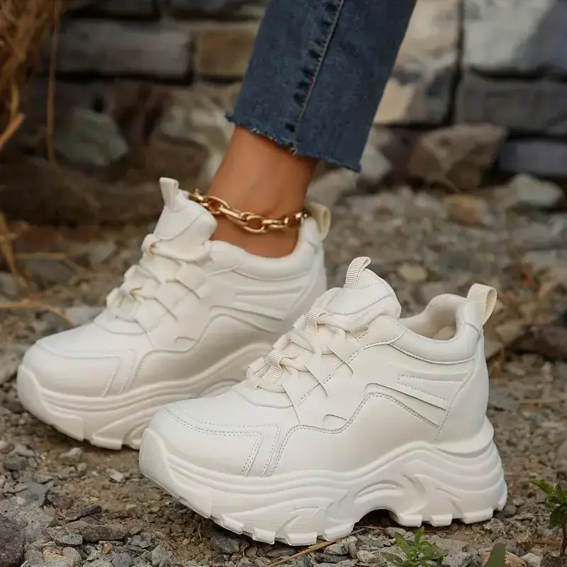 Women's Platform Chunky Sneakers, Solid Color Lace Up Height Increasing Shoes, Casual Walking Shoes Footwear Trainer Lightweight Training