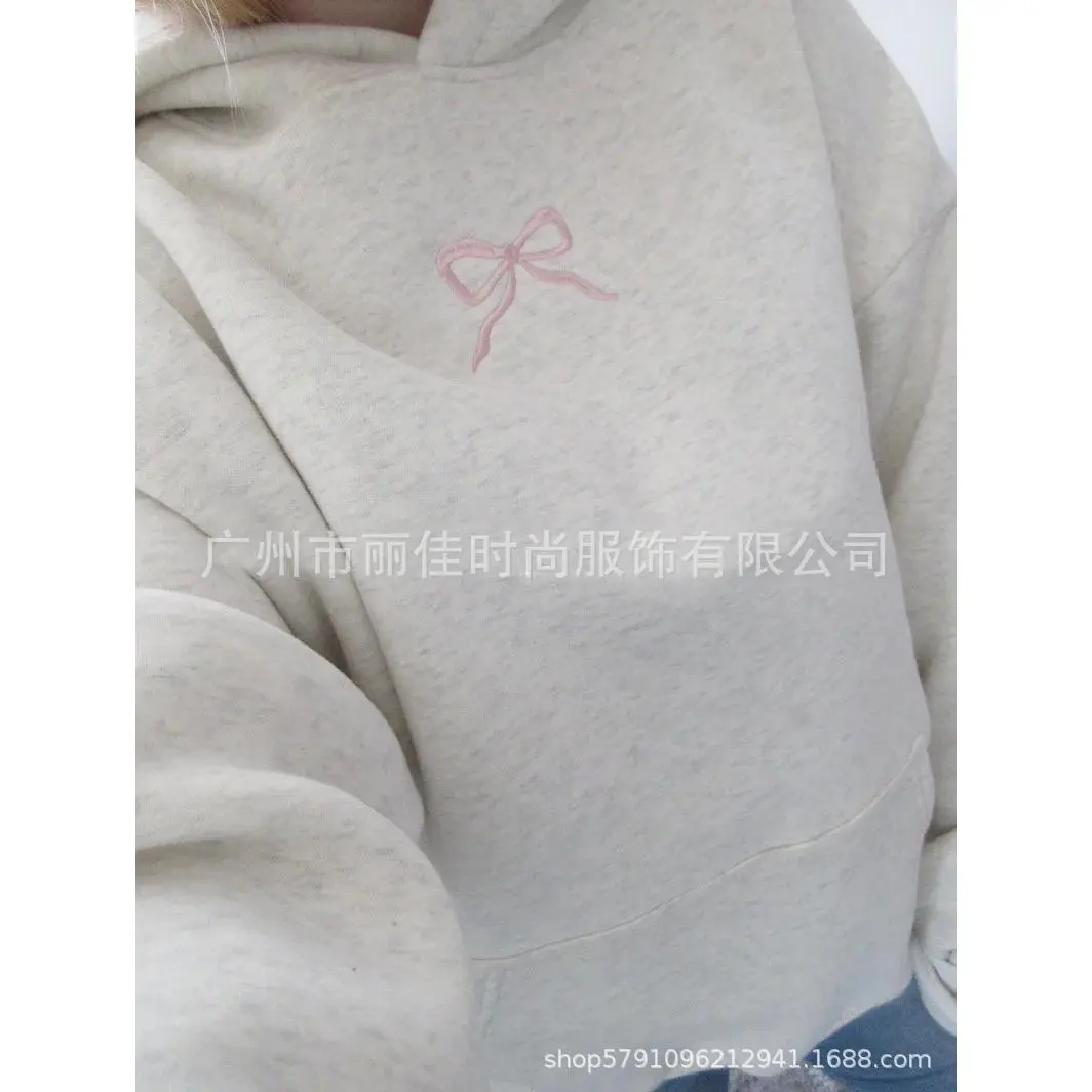Bowknot Hoodie Retro Trend Simple Floral Letter Bowknot Pattern Gray Pullover Sweater Top Embroidered Hoodie Hoodie