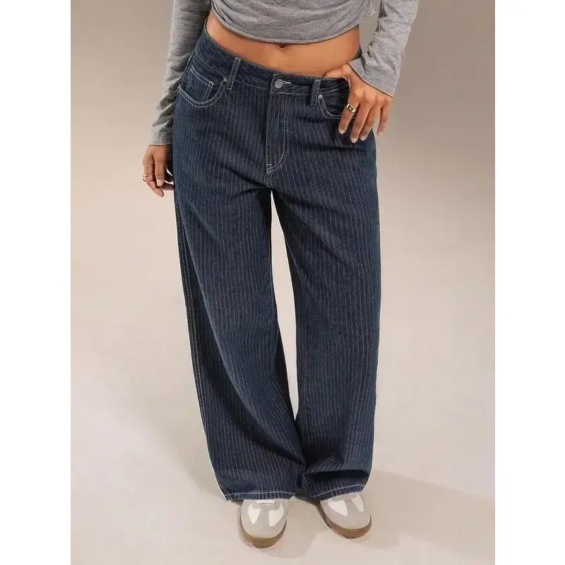 Fabric Elasticity:Non-Stretch Details:Button, Pocket, Zipper Lined For Added Warmth:No Pattern Type:Plain, Striped Style:Casual Pockets:Yes Closure Type:Zipper Fly Body:Unlined Color:Navy Blue Type:Straight Leg Jeans Style:Baggy Waist Line:Low Waist Length:Extra Long Fit Type:Loose Material:Denim Composition:75% Cotton, 12% Viscose, 9% Polyester, 4% Modal Care Instructions:Machine wash or professional dry clean Belt:No Sheer:No