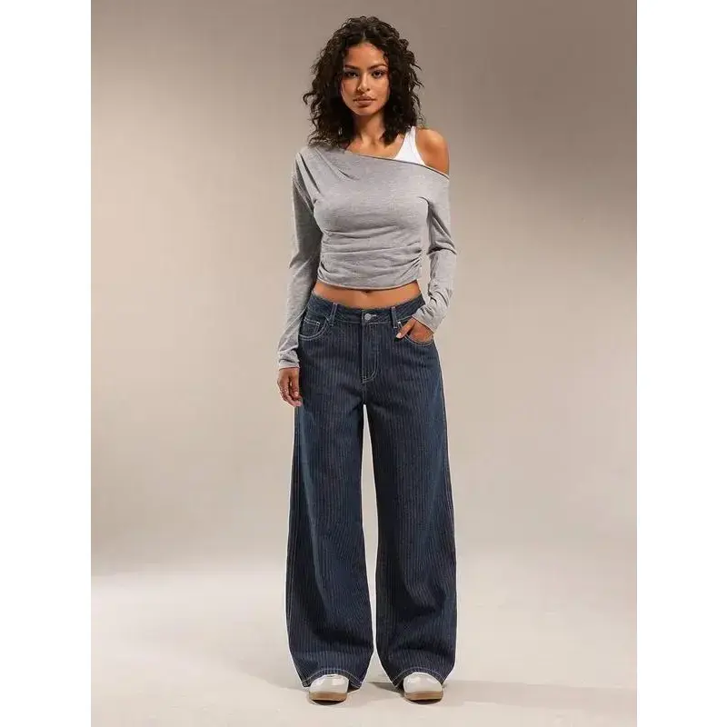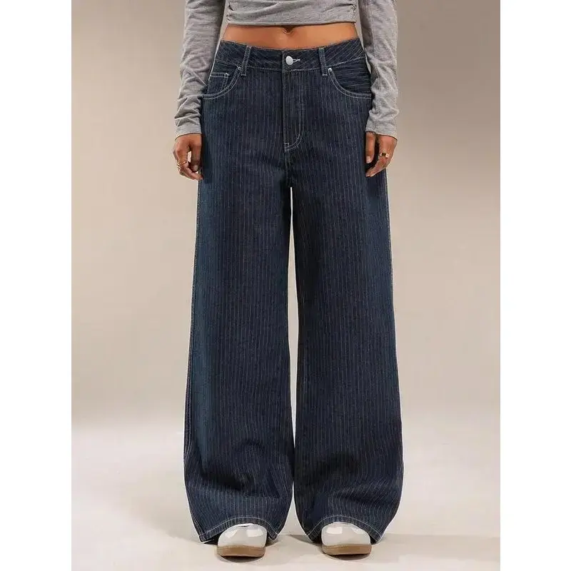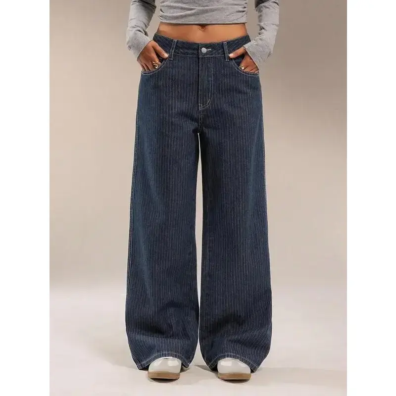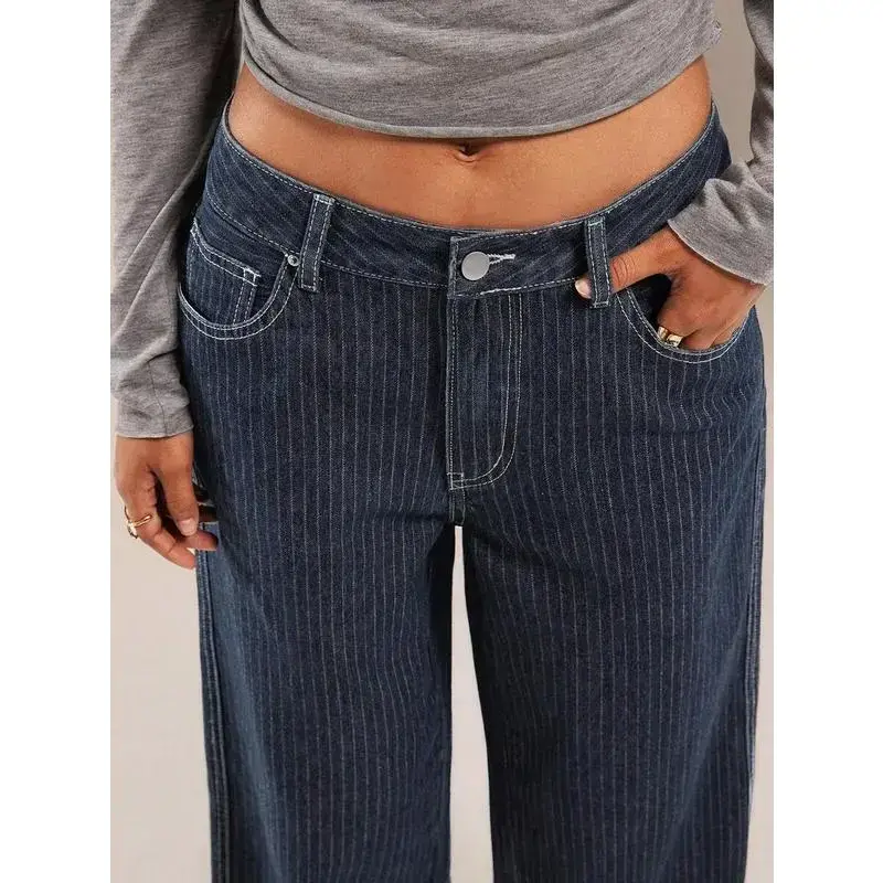 Winter Women Straight Leg Low-Waist Jacquard Striped Washed Dark Denim Pants, Autumn/Winter Low Rise Baggy Jeans