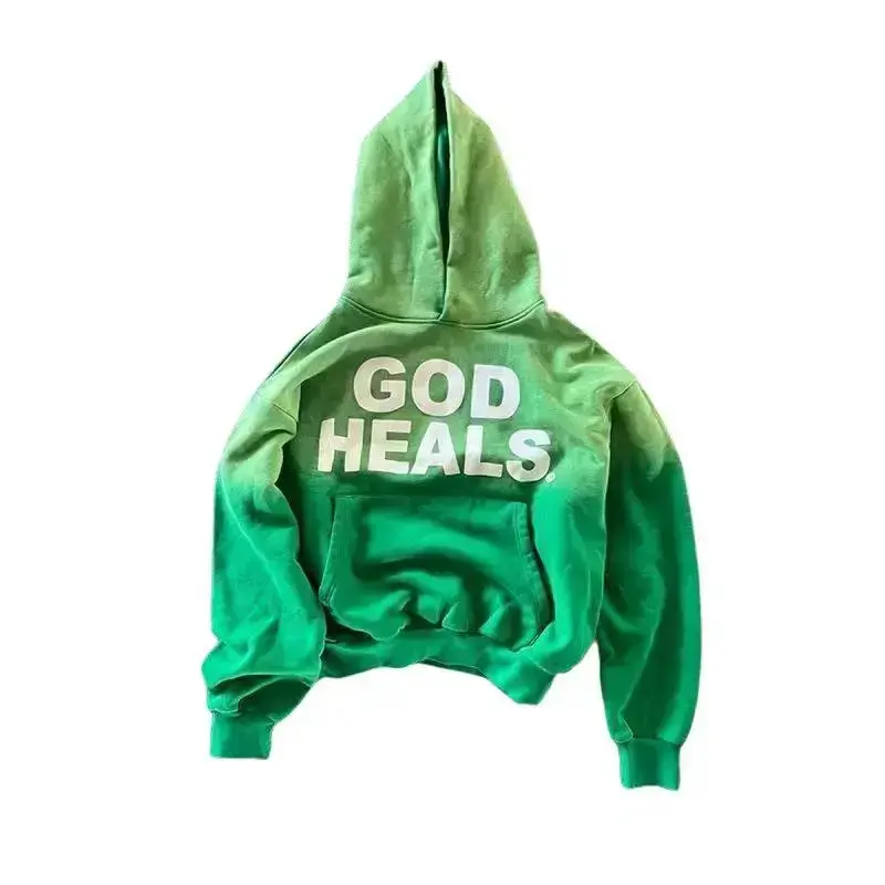 God Heals Print Hoodie Green Long Sleeve Hip Hop Zip Up Jacket for Men Casual Loose Fit Street Style Pullover Tops Menswear Streetwear Stylish Sweatshirts Orange Can be used with raincoat