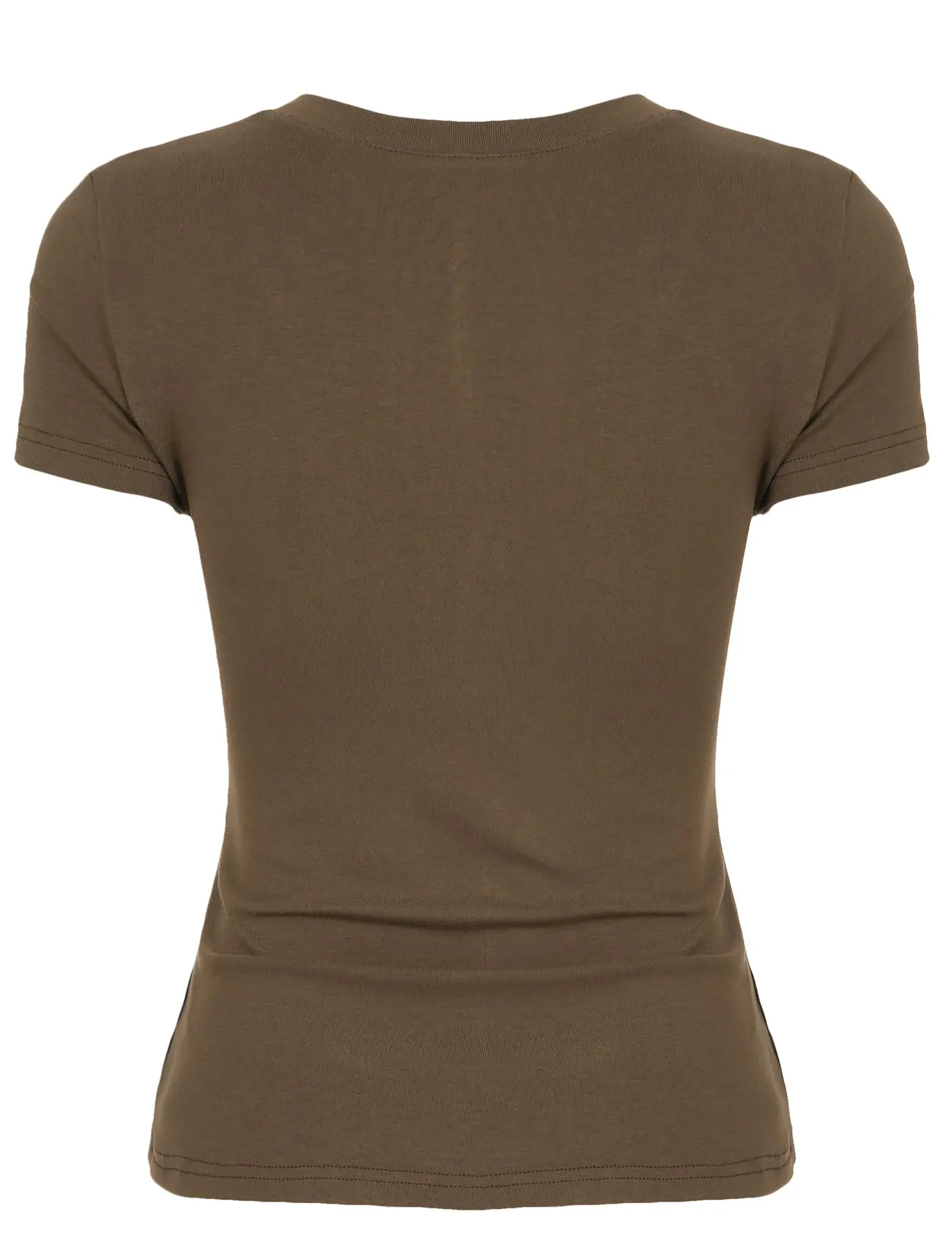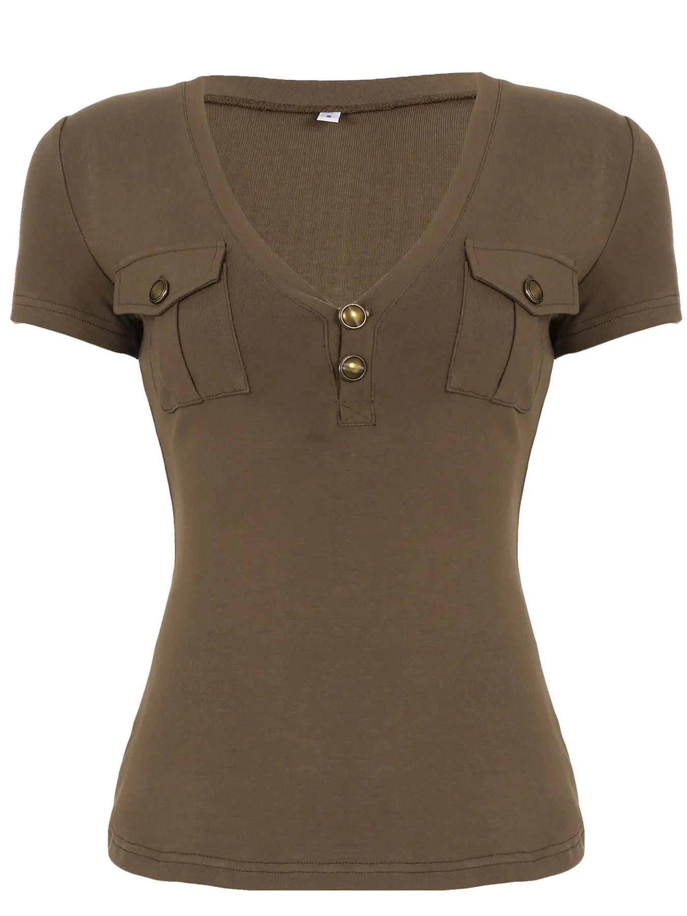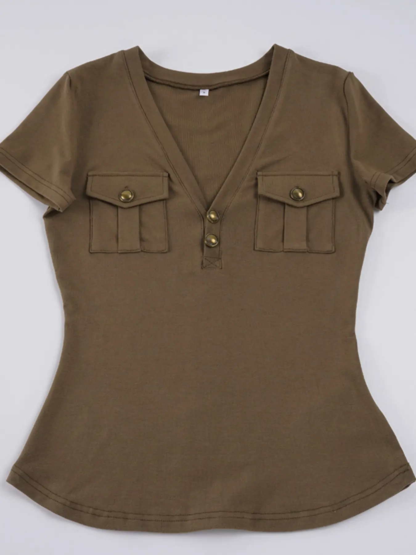 Women's Sexy V-Neck Low Back Pocket T-Shirt, Retro Minimalist Casual Short Sleeve Summer Top, Daily Wear Upper Garment