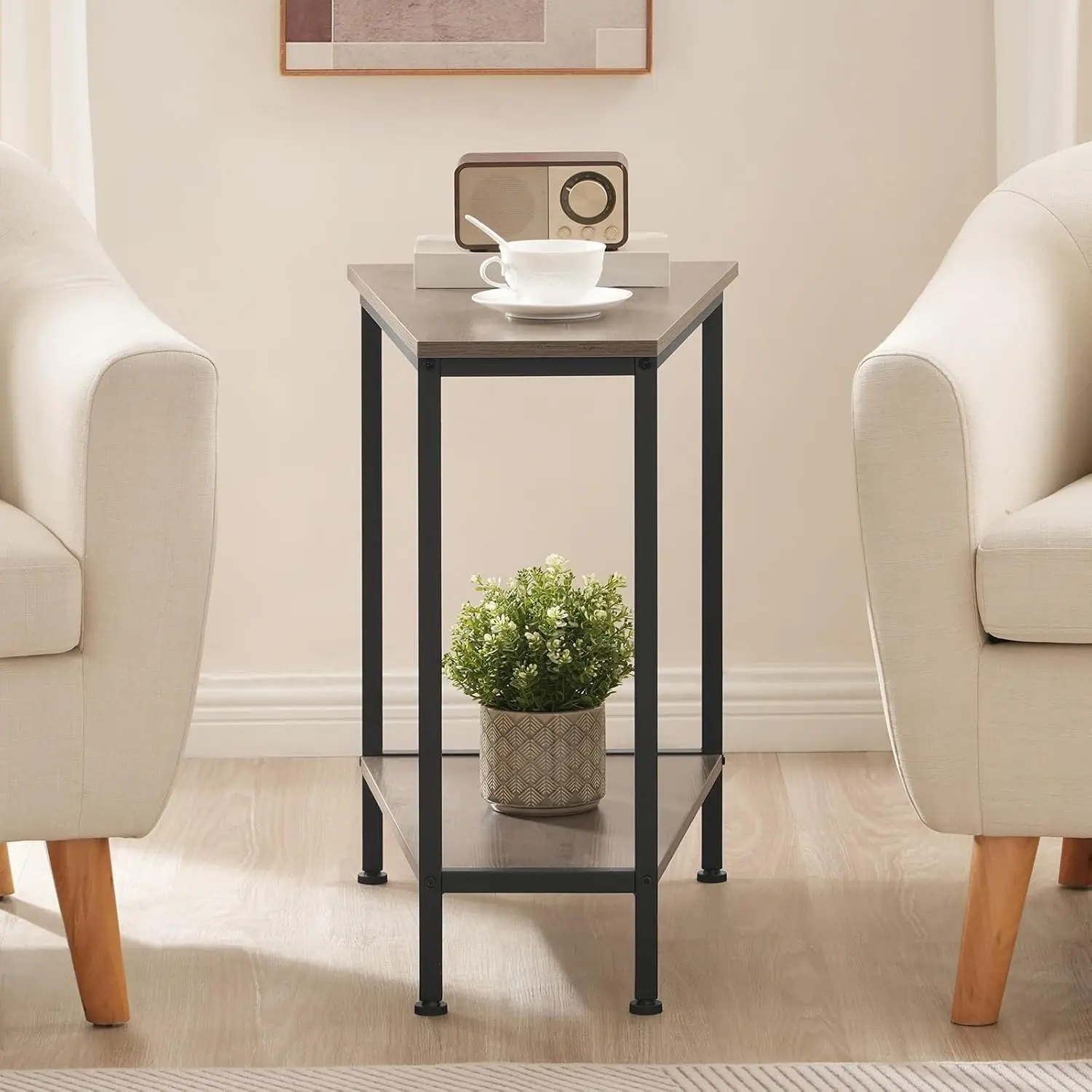 Wedge-shaped side table, recliner wedge-shaped side table with storage function, industrial style triangular decorative table, suitable for small spaces, corners, living rooms, apartments, beige-gray color