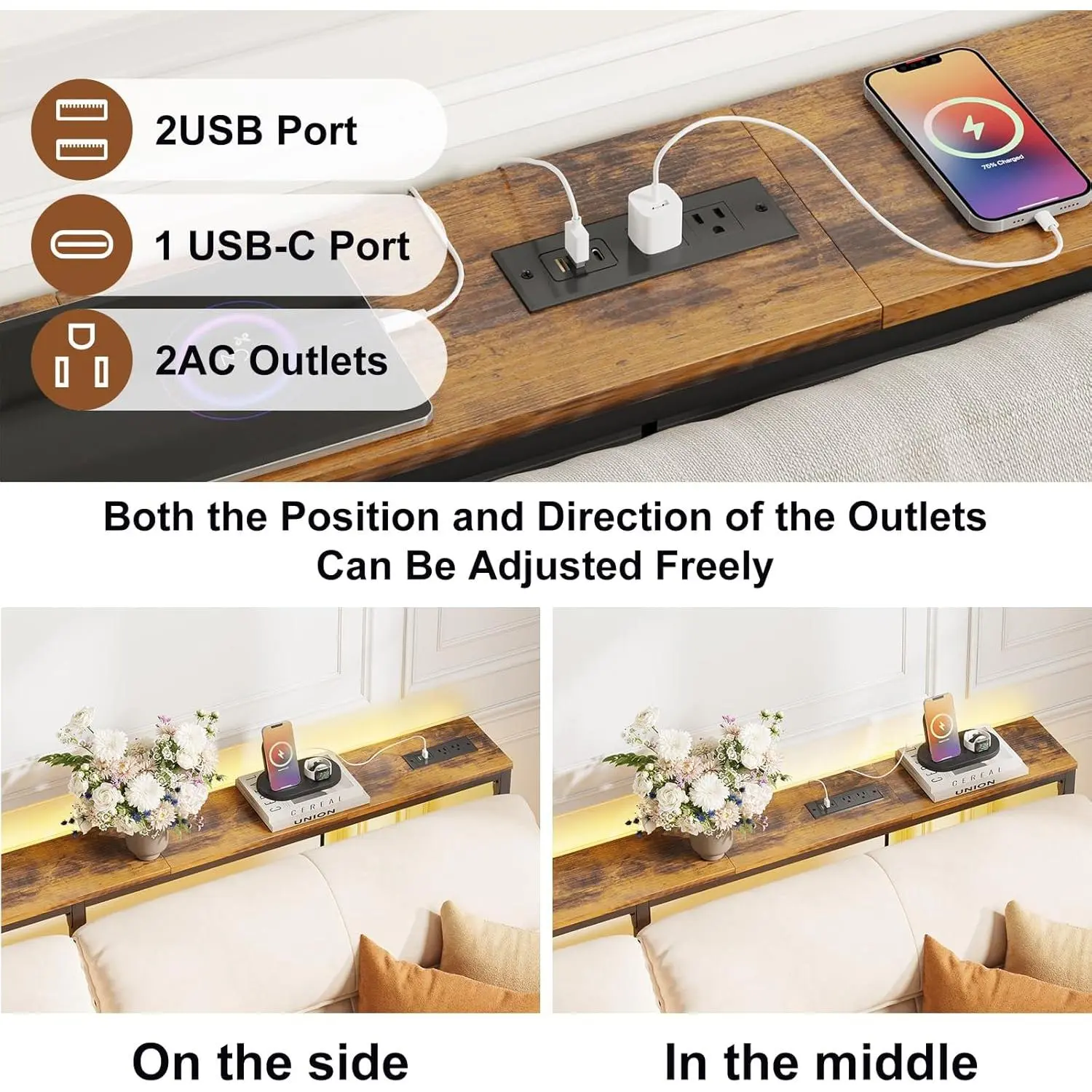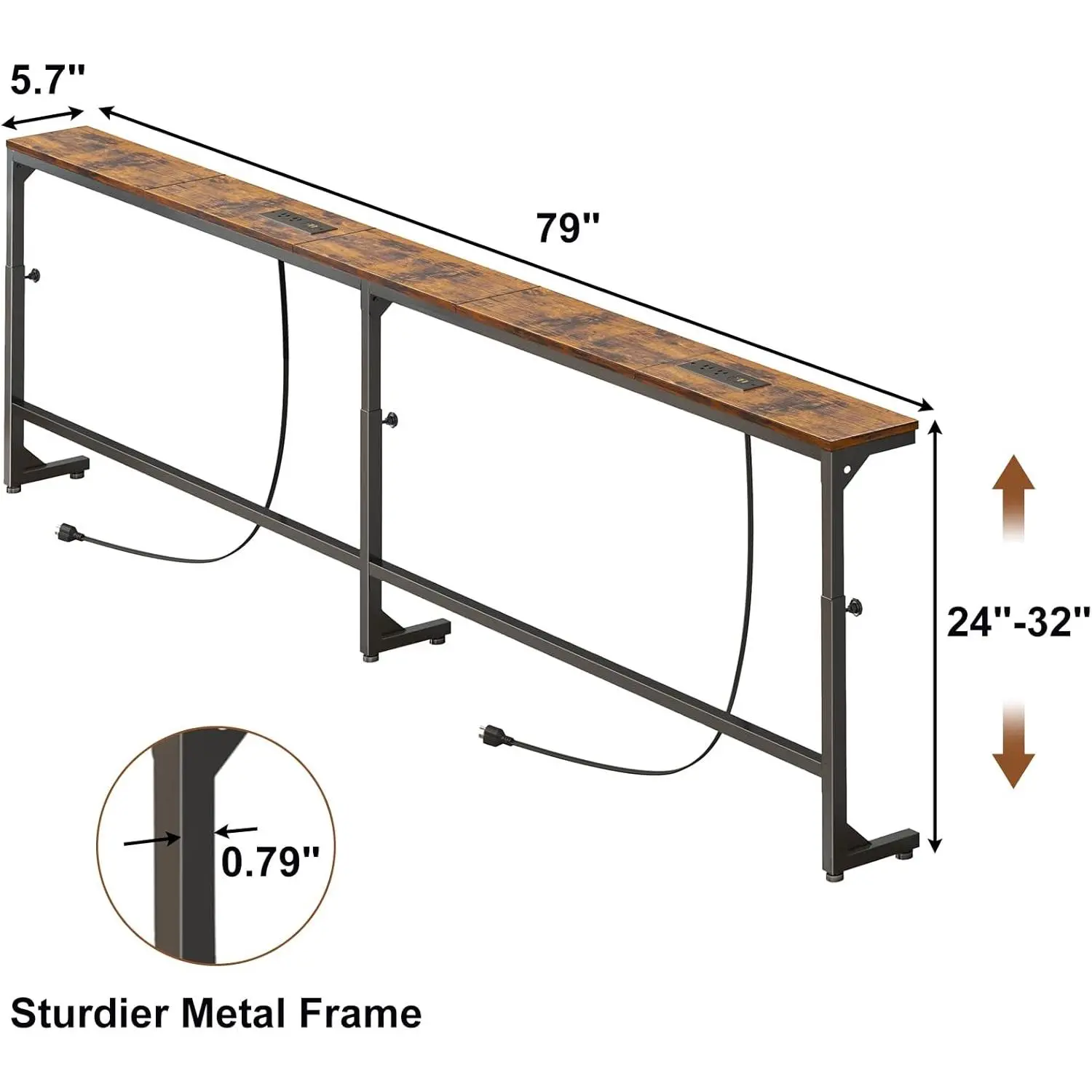 79Inch-wide narrow adjustable height table behind the sofa,With socket,Narrow console table,BeltLEDLamp,Vintage Brown
