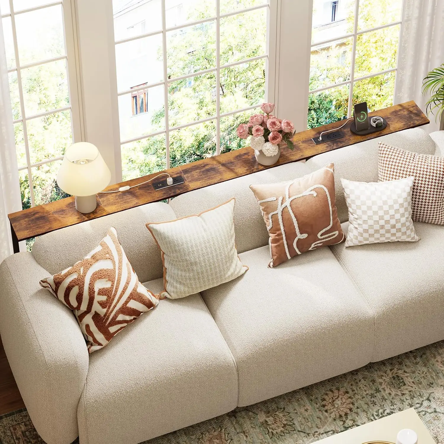 79inch Narrow, height-adjustable table behind the sofa, with power outlets, narrow console table, with LED lights, vintage brown